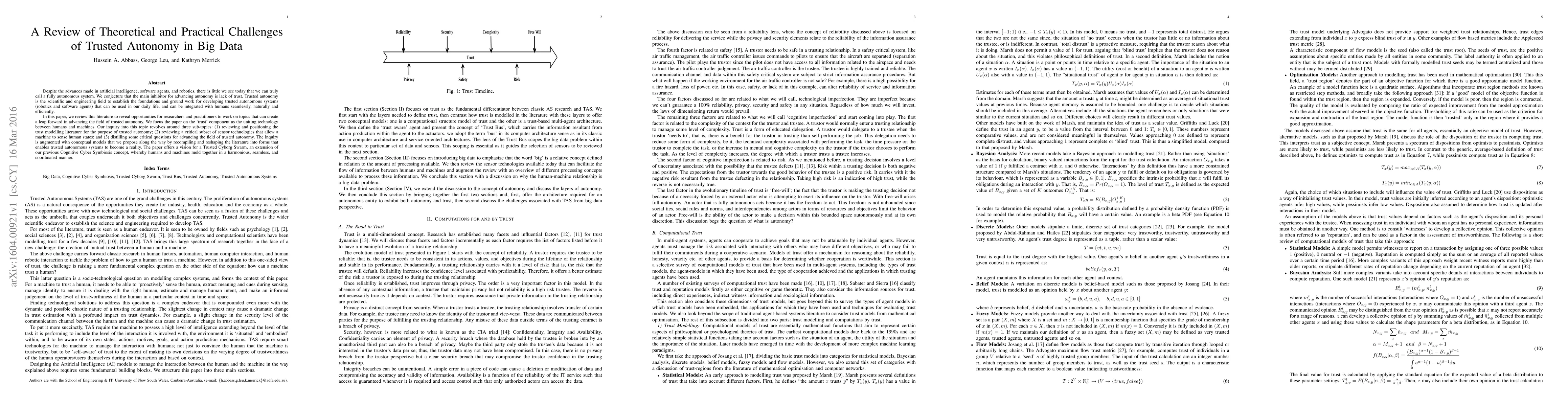 This paper reviews the challenges of trusted autonomy in big data and proposes a vision for Trusted Cyborg Swarm, where humans and machines seamlessly integrate. It highlights key areas for research to advance the field of trusted autonomy and create fully autonomous systems.