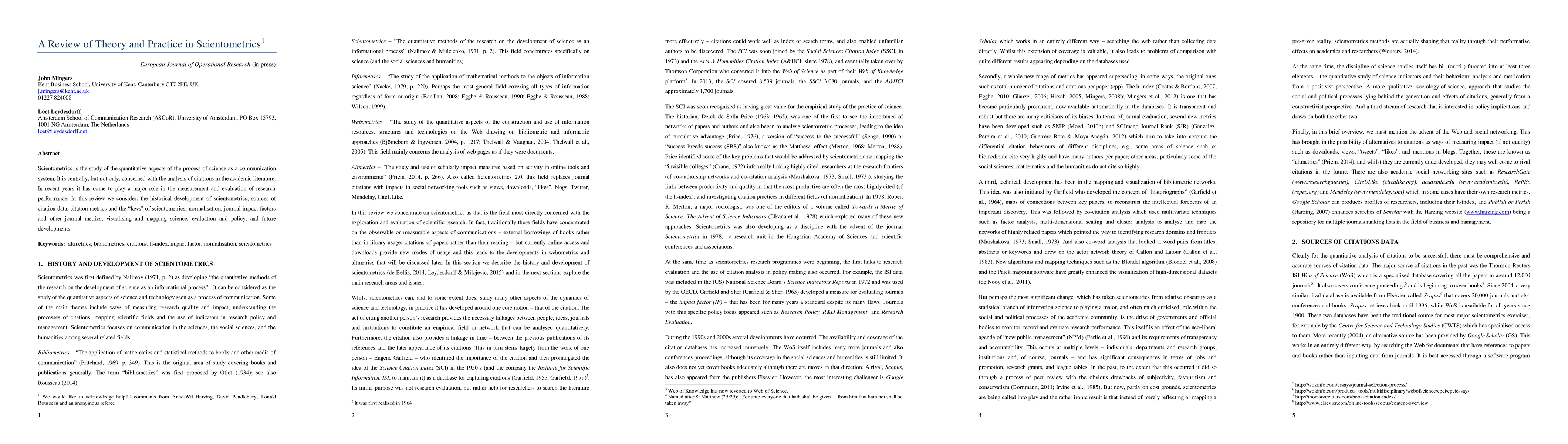 Scientometrics is the study of the quantitative aspects of the process of science as a communication system. It is centrally, but not only, concerned with the analysis of citations in the academic literature. In recent years it has come to play a major role in the measurement and evaluation of research performance. In this review we consider: the historical development of scientometrics, sources of citation data, citation metrics and the "laws" of scientometrics, normalisation, journal impact factors and other journal metrics, visualising and mapping science, evaluation and policy, and future developments.
