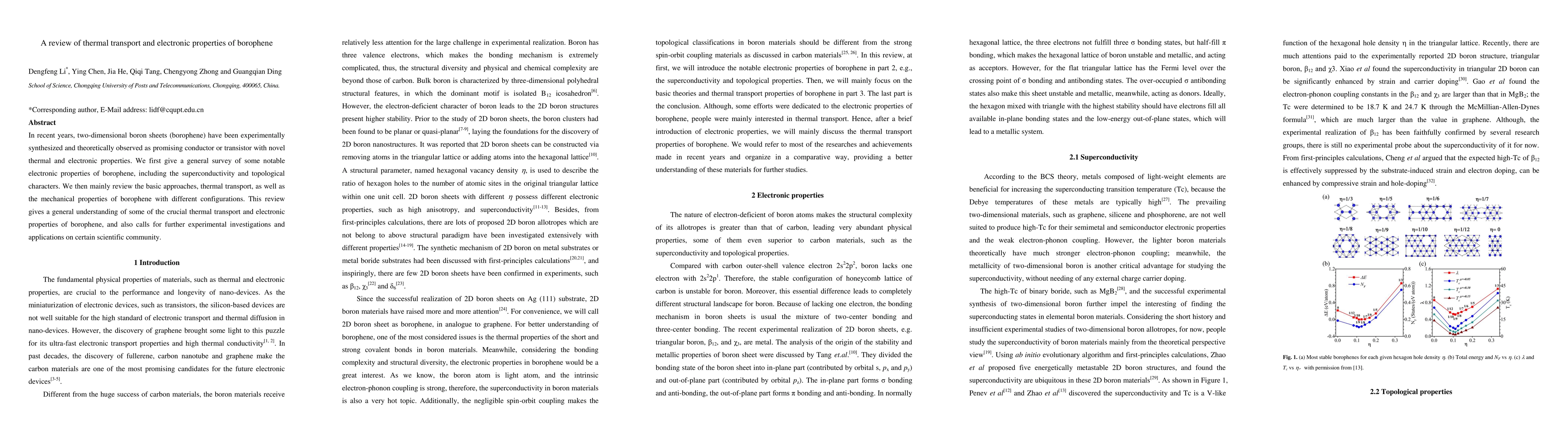 The review provides a comprehensive analysis of thermal transport and electronic properties of borophene, comparing different phases and configurations, and highlighting the potential for applications in transparent conductors and thermal management.