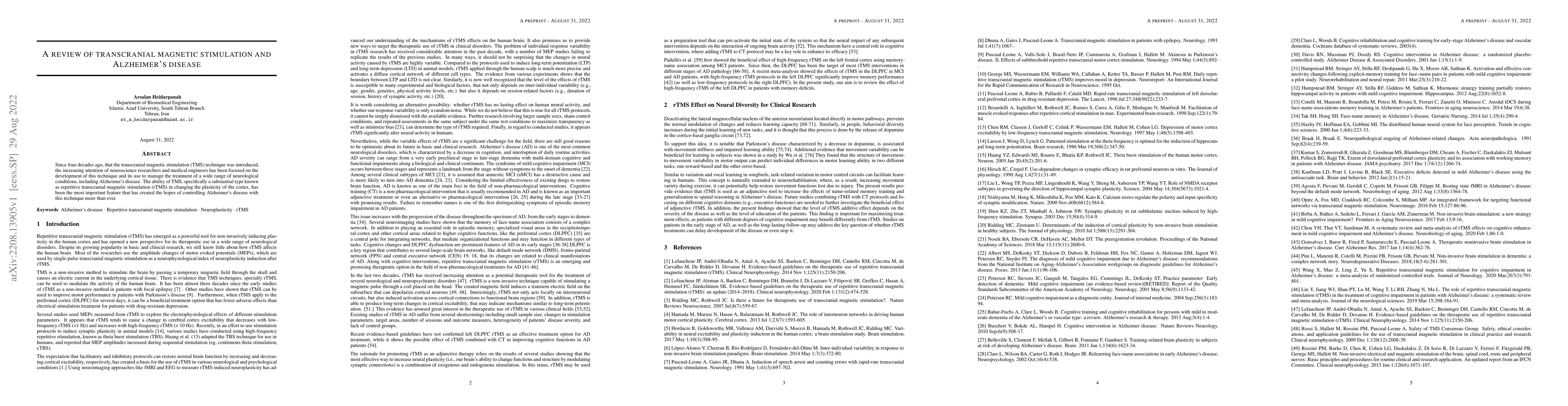 Since four decades ago, that the transcranial magnetic stimulation (TMS) technique was introduced, the increasing attention of neuroscience researchers and medical engineers has been focused on the development of this technique and its use to manage the treatment of a wide range of neurological conditions, including Alzheimer's disease. The ability of TMS, specifically a substantial type known as repetitive transcranial magnetic stimulation (rTMS) in changing the plasticity of the cortex, has been the most important feature that has created the hopes of controlling Alzheimer's disease with this technique more than ever.