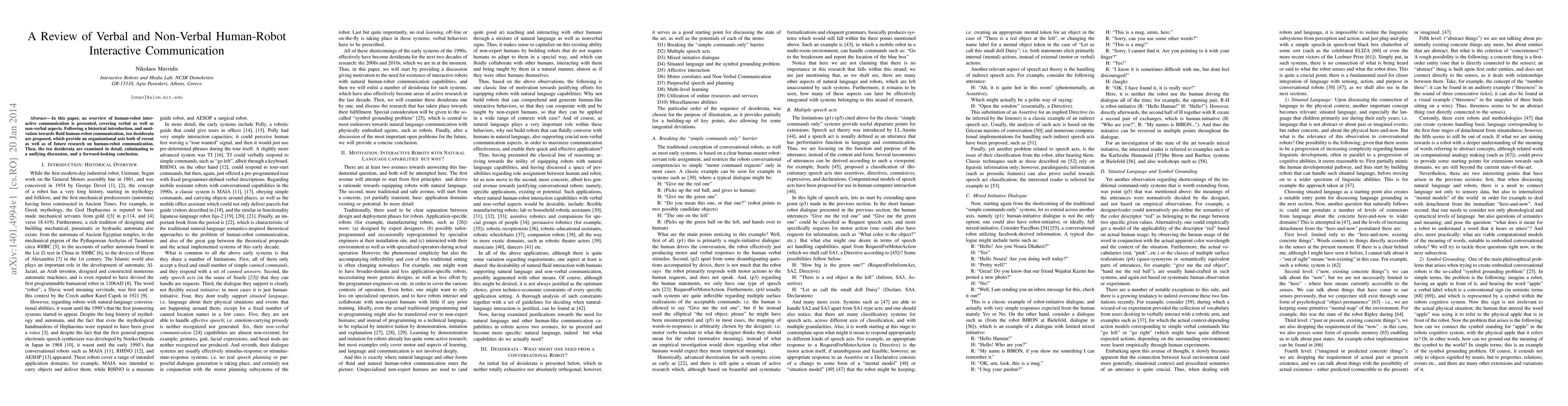 The paper provides a comprehensive review of human-robot interactive communication, covering both verbal and non-verbal aspects, and proposes ten desiderata as an organizational axis for future research.
