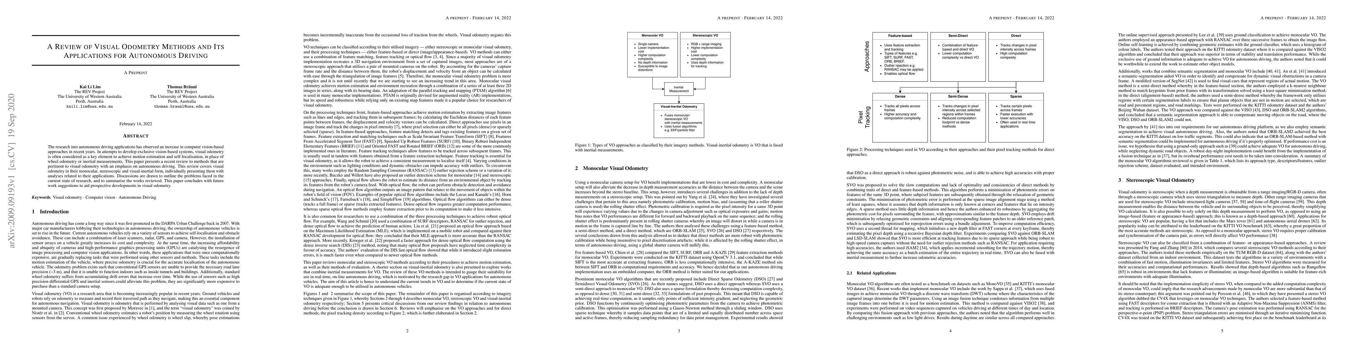 This paper reviews various methods of visual odometry, focusing on their applications in autonomous driving, including monocular, stereoscopic, and visual-inertial approaches. It highlights current challenges and suggests future directions for research in this field.