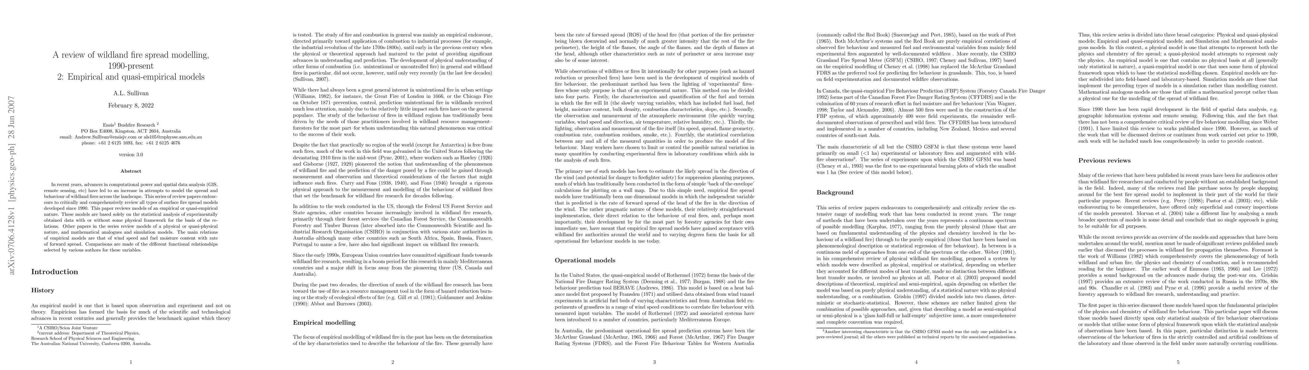 This review paper examines empirical and quasi-empirical models of wildland fire spread since 1990, focusing on the relationships between wind speed, fuel moisture content, and forward spread rate. The study highlights key comparisons among different functional relationships selected by various authors.