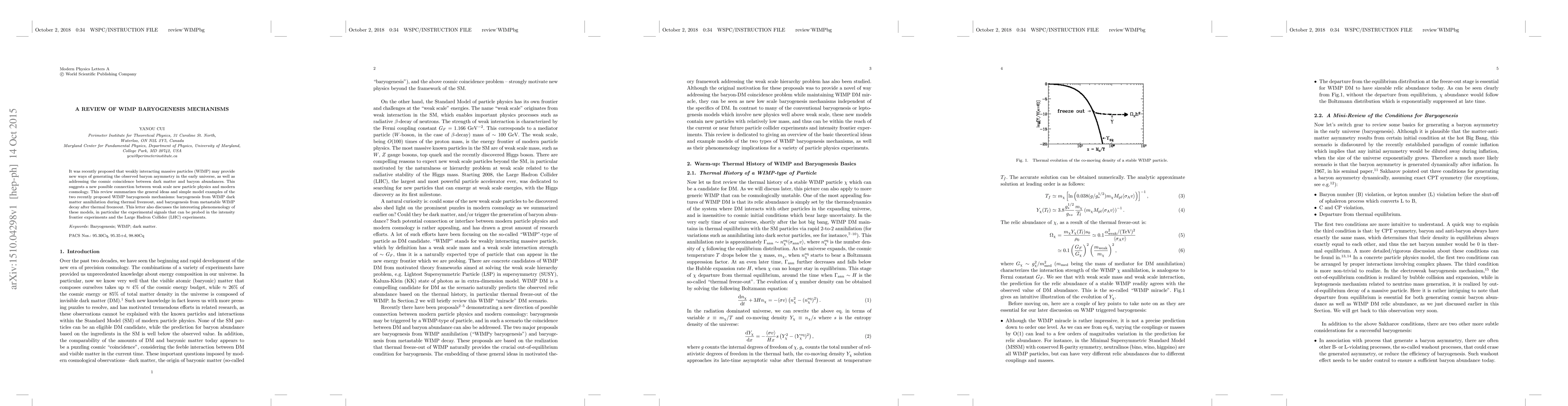 It was recently proposed that weakly interacting massive particles (WIMP) may provide new ways of generating the observed baryon asymmetry in the early universe, as well as addressing the cosmic coincidence between dark matter and baryon abundances. This suggests a new possible connection between weak scale new particle physics and modern cosmology. This review summarizes the general ideas and simple model examples of the two recently proposed WIMP baryogenesis mechanisms: baryogenesis from WIMP dark matter annihilation during thermal freezeout, and baryogenesis from metastable WIMP decay after thermal freezeout. This letter also discusses the interesting phenomenology of these models, in particular the experimental signals that can be probed in the intensity frontier experiments and the Large Hadron Collider (LHC) experiments.