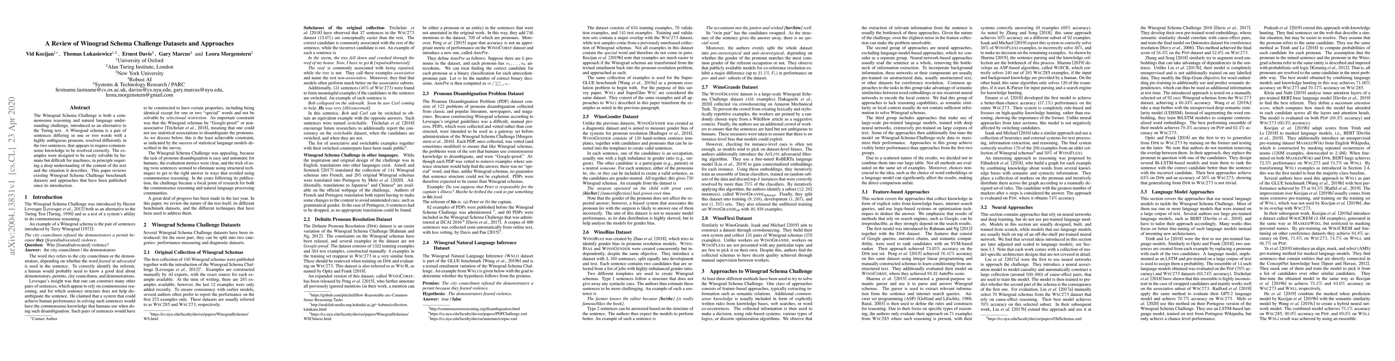 This paper reviews the Winograd Schema Challenge datasets and approaches, highlighting how these tests require commonsense reasoning and natural language understanding, designed to be simple for humans but challenging for machines. It surveys the published benchmarks and methodologies since the challenge's introduction.