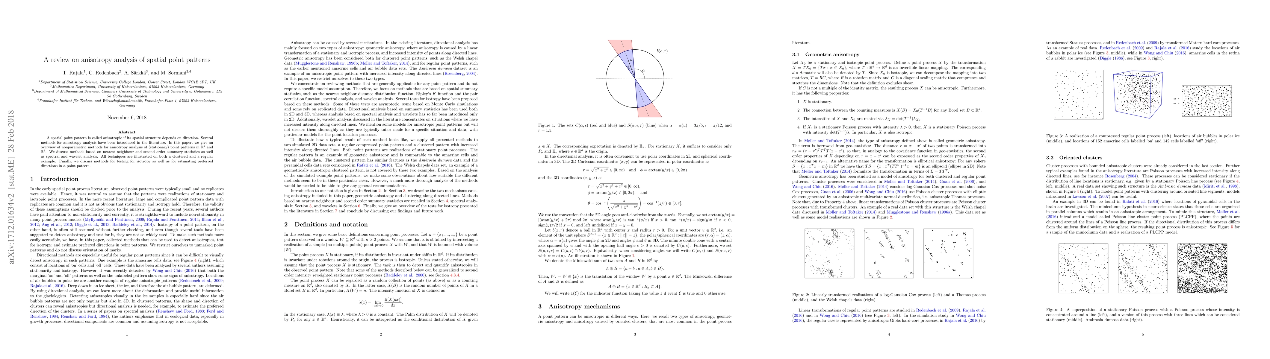 This paper reviews nonparametric methods for analyzing anisotropy in spatial point patterns, focusing on techniques in $\mathbf{R}^2$ and $\mathbf{R}^3$. It covers methods based on nearest neighbor, second-order statistics, spectral, and wavelet analysis, and includes examples to illustrate these techniques.