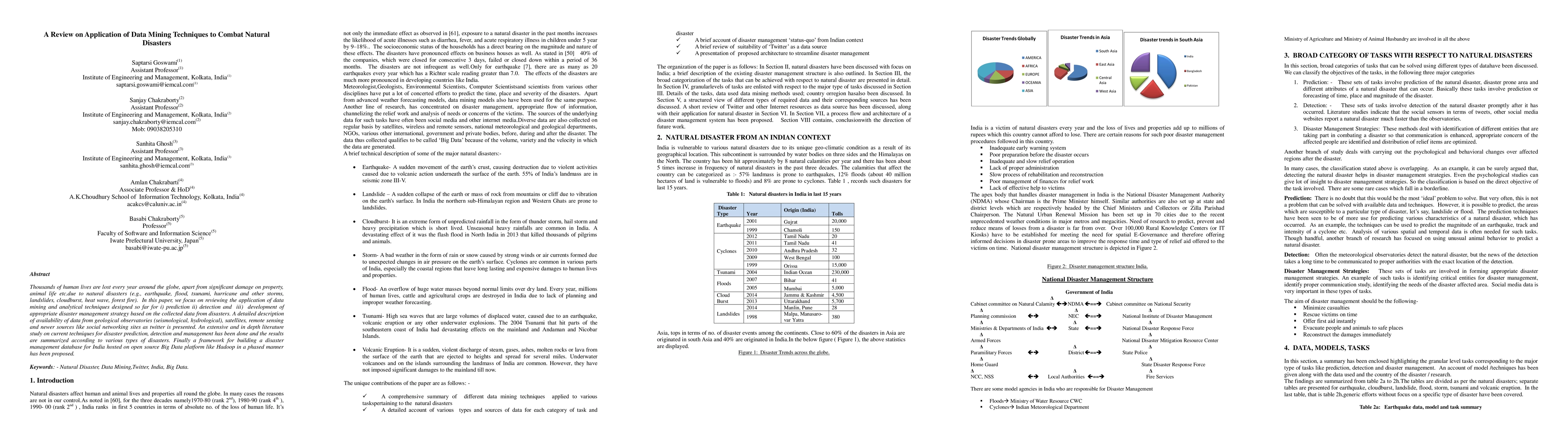 This paper reviews data mining techniques for predicting, detecting, and managing natural disasters, emphasizing data sources like geological observatories and social media. It proposes a framework for a disaster management database in India using open-source Big Data platforms.