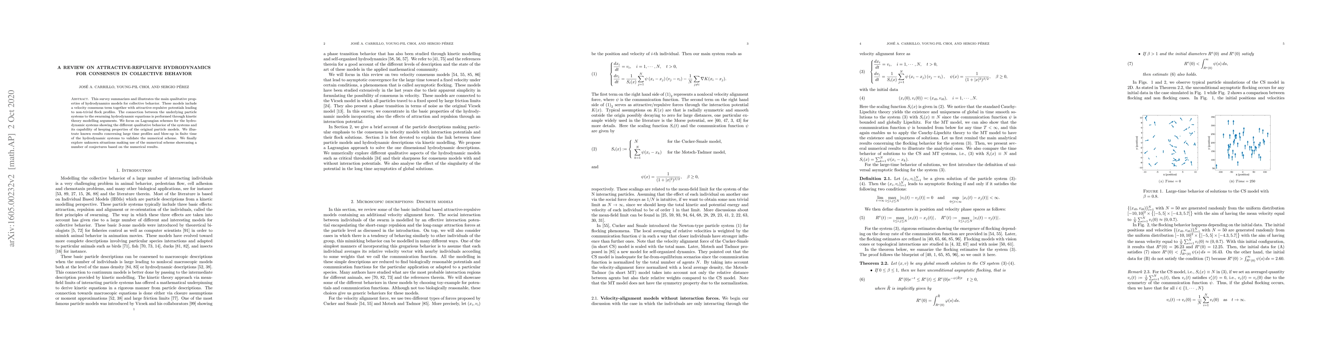 This paper reviews hydrodynamic models for collective behavior, focusing on velocity consensus and attractive-repulsive potentials. It explores Lagrangian schemes and their ability to maintain properties of particle models, illustrating large time profiles and finite time blow-up, while also proposing new conjectures based on numerical simulations.