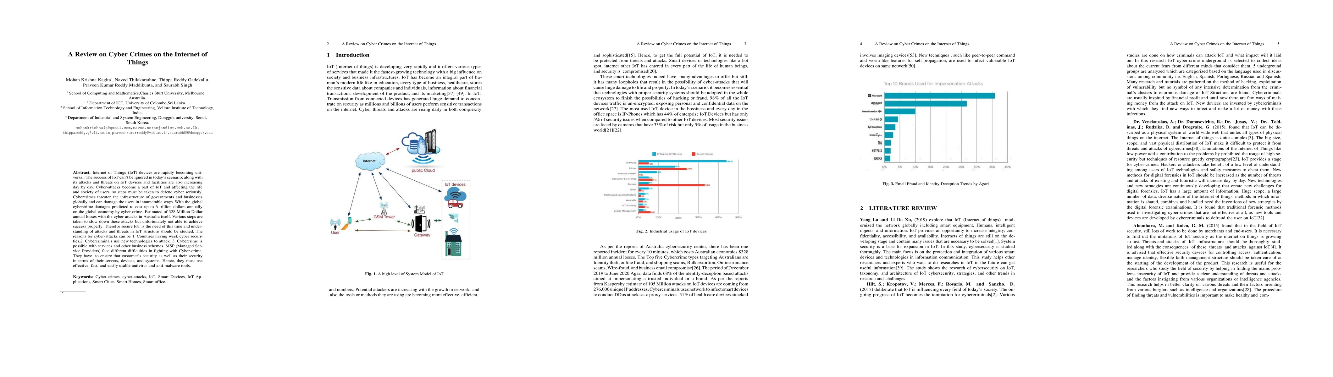 Internet of Things (IoT) devices are rapidly becoming universal. The success of IoT cannot be ignored in the scenario today, along with its attacks and threats on IoT devices and facilities are also increasing day by day. Cyber attacks become a part of IoT and affecting the life and society of users, so steps must be taken to defend cyber seriously. Cybercrimes threaten the infrastructure of governments and businesses globally and can damage the users in innumerable ways. With the global cybercrime damages predicted to cost up to 6 trillion dollars annually on the global economy by cyber crime. Estimated of 328 Million Dollar annual losses with the cyber attacks in Australia itself. Various steps are taken to slow down these attacks but unfortunately not able to achieve success properly. Therefor secure IoT is the need of this time and understanding of attacks and threats in IoT structure should be studied. The reasons for cyber-attacks can be Countries having week cyber securities, Cybercriminals use new technologies to attack, Cybercrime is possible with services and other business schemes. MSP (Managed Service Providers) face different difficulties in fighting with Cyber-crime. They have to ensure that security of the customer as well as their security in terms of their servers, devices, and systems. Hence, they must use effective, fast, and easily usable antivirus and antimalware tools.