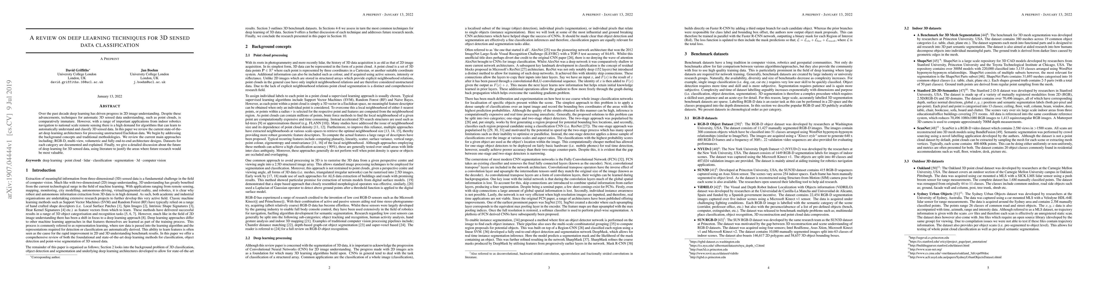 This paper reviews advanced deep learning techniques for classifying 3D sensed data, including point clouds, and compares various architectures like RGB-D, multi-view, volumetric, and end-to-end designs. It highlights the current state-of-the-art and identifies promising future research directions.