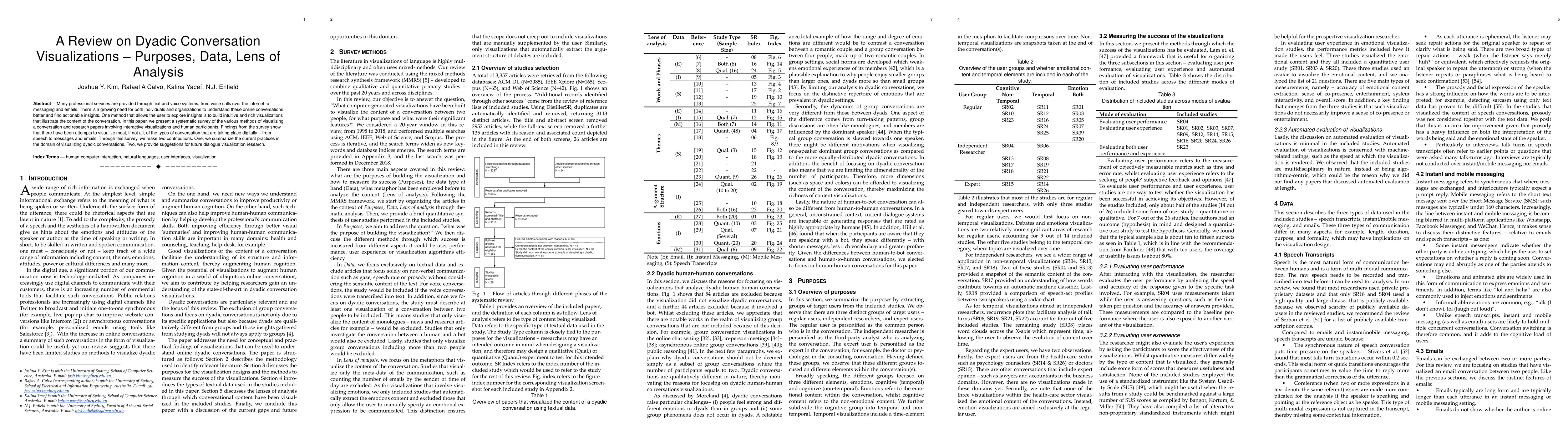 This paper systematically reviews methods for visualizing dyadic conversations, summarizing current practices and suggesting future research directions. It highlights the growing need for better understanding of online interactions through intuitive visualizations.