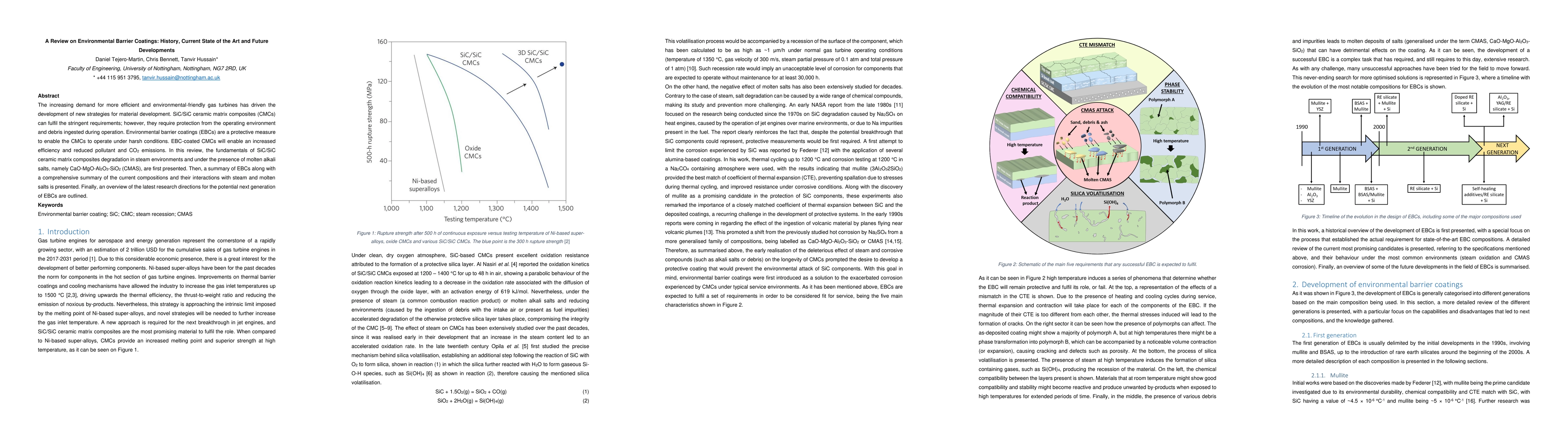 The increasing demand for more efficient and environmental-friendly gas turbines has driven the development of new strategies for material development. SiC/SiC ceramic matrix composites (CMCs) can fulfil the stringent requirements; however, they require protection from the operating environment and debris ingested during operation. Environmental barrier coatings (EBCs) are a protective measure to enable the CMCs to operate under harsh conditions. EBC-coated CMCs will enable an increased efficiency and reduced pollutant and CO2 emissions. In this review, the fundamentals of SiC/SiC ceramic matrix composites degradation in steam environments and under the presence of molten alkali salts, namely CaO-MgO-Al2O3-SiO2 (CMAS), are first presented. Then, a summary of EBCs along with a comprehensive summary of the current compositions and their interactions with steam and molten salts is presented. Finally, an overview of the latest research directions for the potential next generation of EBCs are outlined