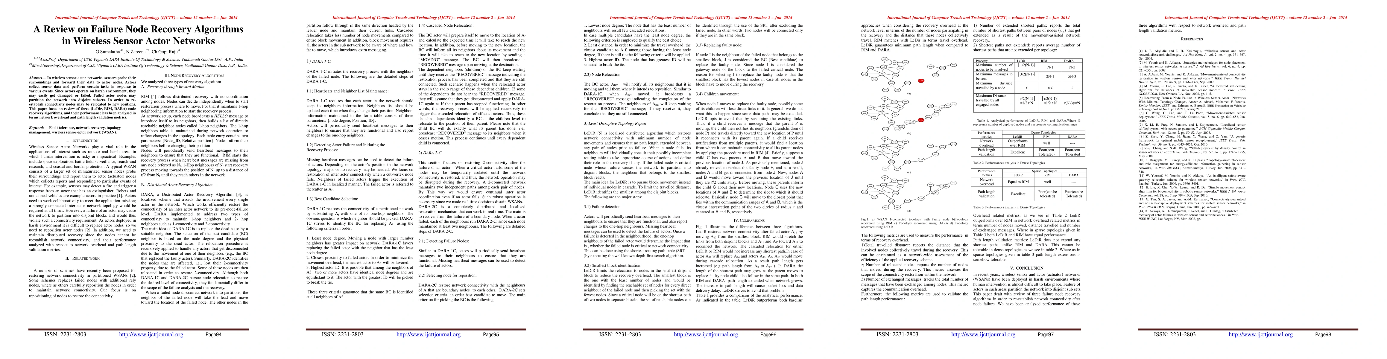 This paper reviews three node recovery algorithms (LeDir, RIM, DARA) for wireless sensor-actor networks, focusing on their performance in terms of network overhead and path length validation after actor nodes fail and potentially partition the network.