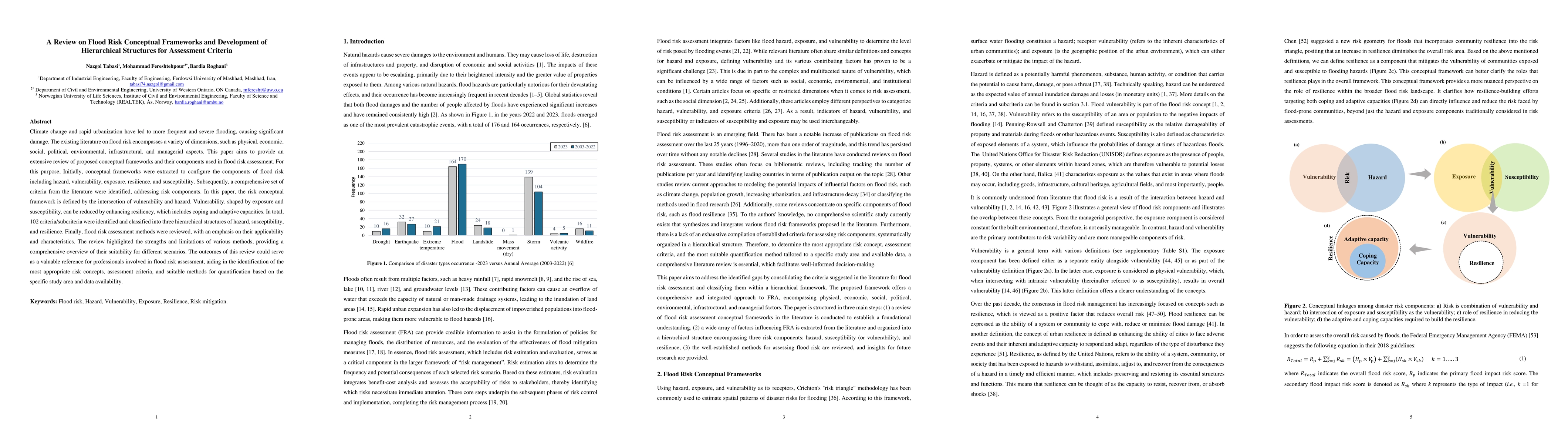 This paper reviews various flood risk conceptual frameworks and develops hierarchical structures for assessment criteria, identifying 102 criteria grouped into hazard, susceptibility, and resilience categories. The review emphasizes the interplay between vulnerability and hazard, highlighting strengths and limitations of different assessment methods for diverse scenarios.