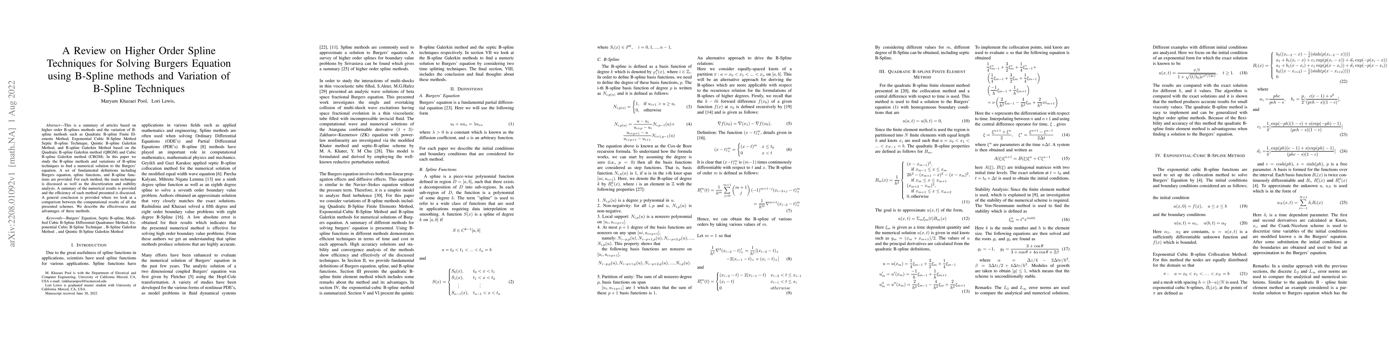 This is a summary of articles based on higher order B-splines methods and the variation of B-spline methods such as Quadratic B-spline Finite Elements Method, Exponential Cubic B-Spline Method Septic B-spline Technique, Quintic B-spline Galerkin Method, and B-spline Galerkin Method based on the Quadratic B-spline Galerkin method (QBGM) and Cubic B-spline Galerkin method (CBGM). In this paper we study the B-spline methods and variations of B-spline techniques to find a numerical solution to the Burgers' equation. A set of fundamental definitions including Burgers equation, spline functions, and B-spline functions are provided. For each method, the main technique is discussed as well as the discretization and stability analysis. A summary of the numerical results is provided and the efficiency of each method presented is discussed. A general conclusion is provided where we look at a comparison between the computational results of all the presented schemes. We describe the effectiveness and advantages of these methods