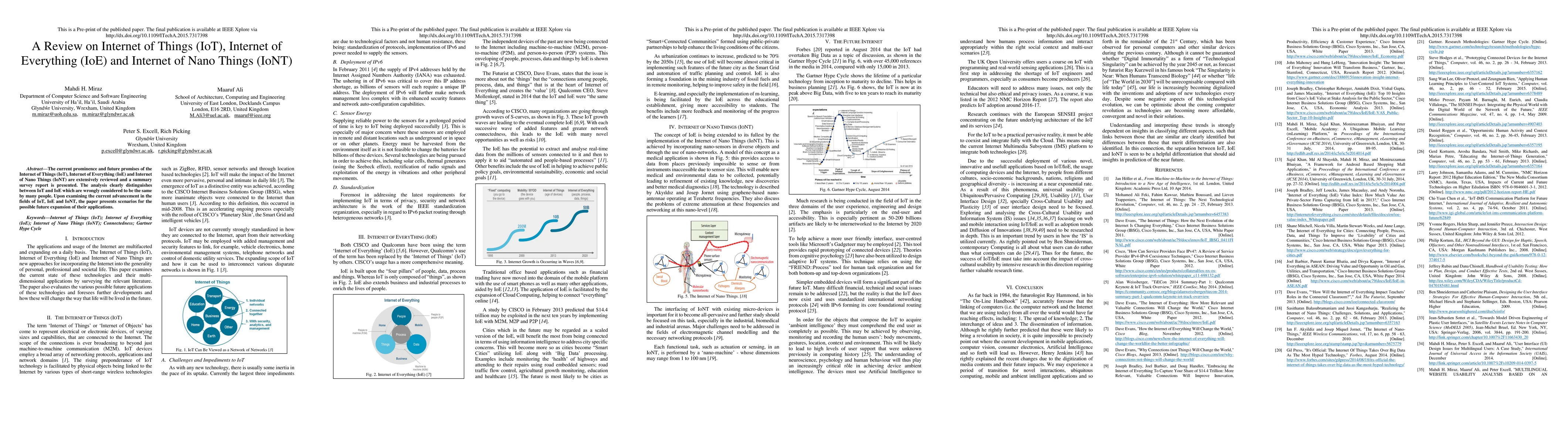 The current prominence and future promises of the Internet of Things (IoT), Internet of Everything (IoE) and Internet of Nano Things (IoNT) are extensively reviewed and a summary survey report is presented. The analysis clearly distinguishes between IoT and IoE which are wrongly considered to be the same by many people. Upon examining the current advancement in the fields of IoT, IoE and IoNT, the paper presents scenarios for the possible future expansion of their applications.