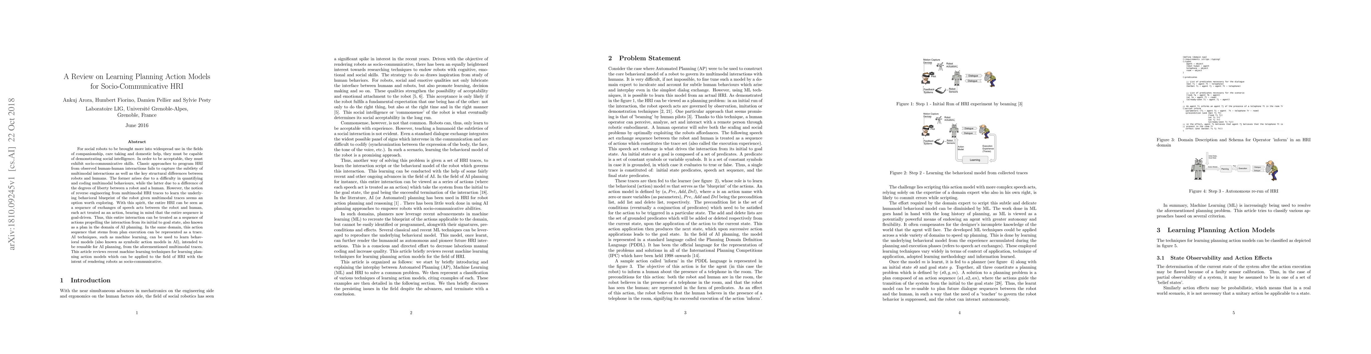 For social robots to be brought more into widespread use in the fields of companionship, care taking and domestic help, they must be capable of demonstrating social intelligence. In order to be acceptable, they must exhibit socio-communicative skills. Classic approaches to program HRI from observed human-human interactions fails to capture the subtlety of multimodal interactions as well as the key structural differences between robots and humans. The former arises due to a difficulty in quantifying and coding multimodal behaviours, while the latter due to a difference of the degrees of liberty between a robot and a human. However, the notion of reverse engineering from multimodal HRI traces to learn the underlying behavioral blueprint of the robot given multimodal traces seems an option worth exploring. With this spirit, the entire HRI can be seen as a sequence of exchanges of speech acts between the robot and human, each act treated as an action, bearing in mind that the entire sequence is goal-driven. Thus, this entire interaction can be treated as a sequence of actions propelling the interaction from its initial to goal state, also known as a plan in the domain of AI planning. In the same domain, this action sequence that stems from plan execution can be represented as a trace. AI techniques, such as machine learning, can be used to learn behavioral models (also known as symbolic action models in AI), intended to be reusable for AI planning, from the aforementioned multimodal traces. This article reviews recent machine learning techniques for learning planning action models which can be applied to the field of HRI with the intent of rendering robots as socio-communicative.