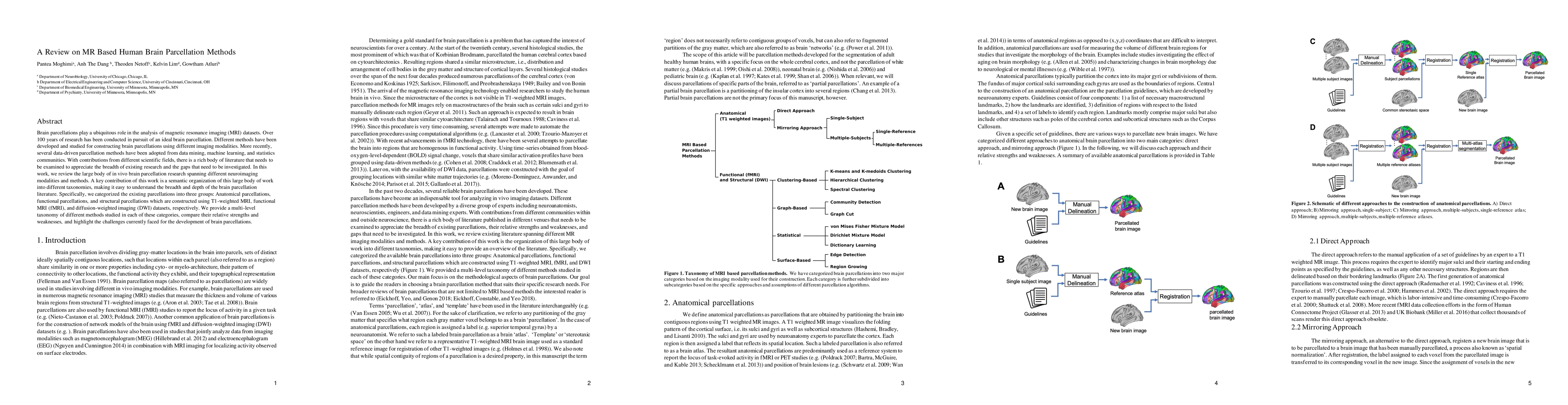 This paper reviews brain parcellation methods for MRI datasets, categorizing them into anatomical, functional, and structural parcellations based on T1-weighted, fMRI, and DWI datasets respectively. It provides a taxonomy of methods, compares their strengths and weaknesses, and identifies current challenges in brain parcellation research.