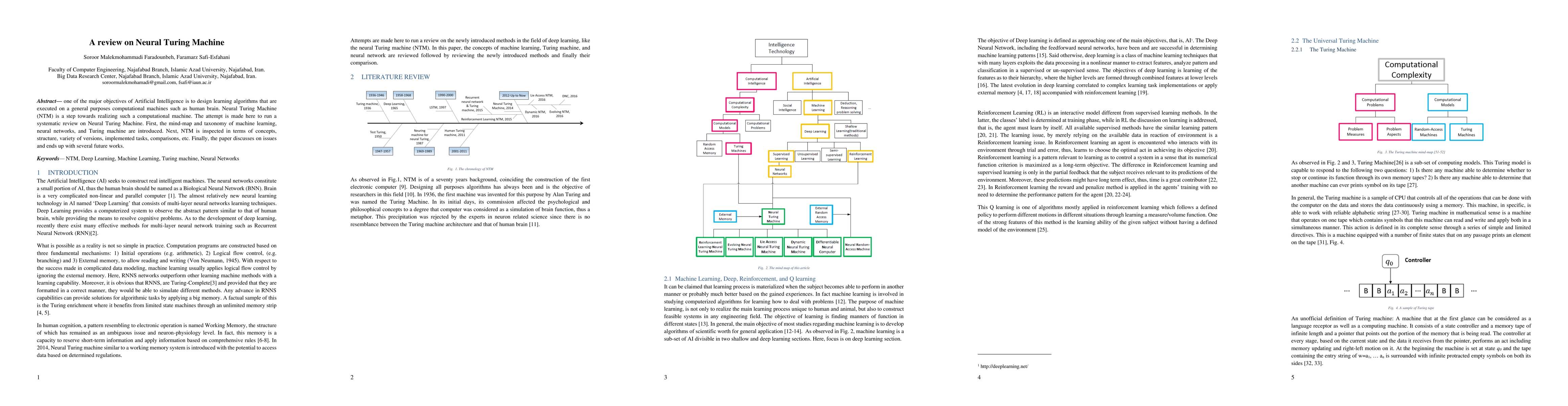 One of the major objectives of Artificial Intelligence is to design learning algorithms that are executed on a general purposes computational machines such as human brain. Neural Turing Machine (NTM) is a step towards realizing such a computational machine. The attempt is made here to run a systematic review on Neural Turing Machine. First, the mind-map and taxonomy of machine learning, neural networks, and Turing machine are introduced. Next, NTM is inspected in terms of concepts, structure, variety of versions, implemented tasks, comparisons, etc. Finally, the paper discusses on issues and ends up with several future works.