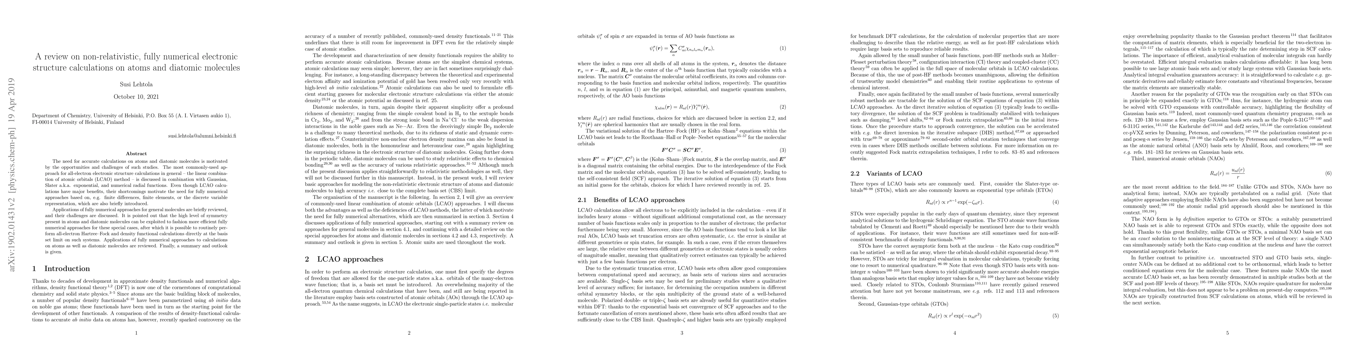 This paper reviews the use of fully numerical methods for electronic structure calculations on atoms and diatomic molecules, highlighting the advantages and challenges of these approaches over traditional LCAO methods. The paper discusses the application of fully numerical techniques like finite differences and finite elements, and emphasizes the potential for efficiency gains due to the high symmetry of these systems.