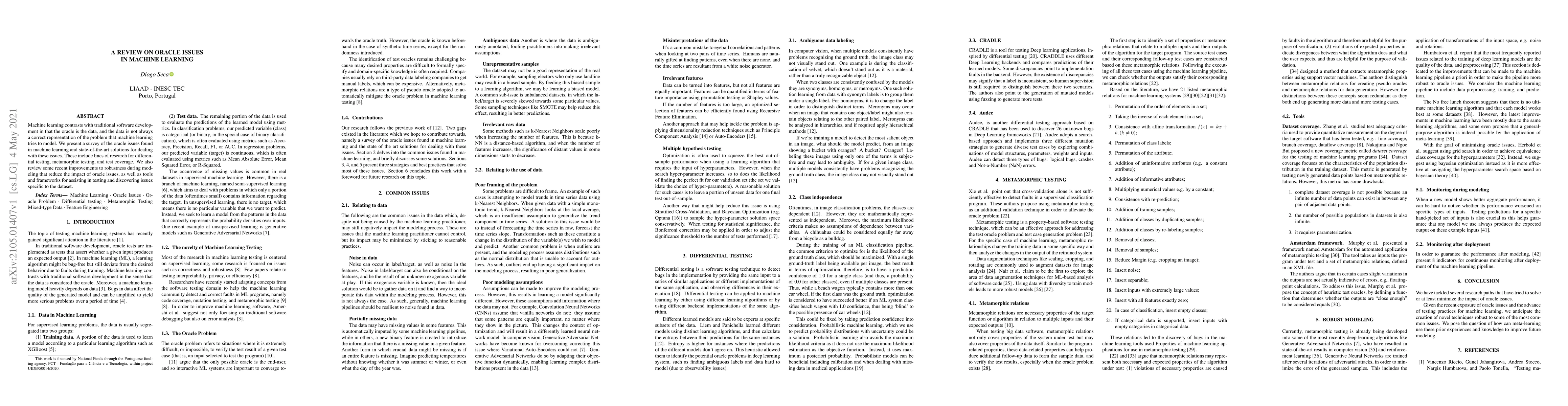 This paper reviews challenges related to the "oracle" in machine learning, where data may not accurately represent the underlying problem. It surveys current solutions, including differential testing, metamorphic testing, and test coverage, and discusses tools that help identify and mitigate these oracle issues.