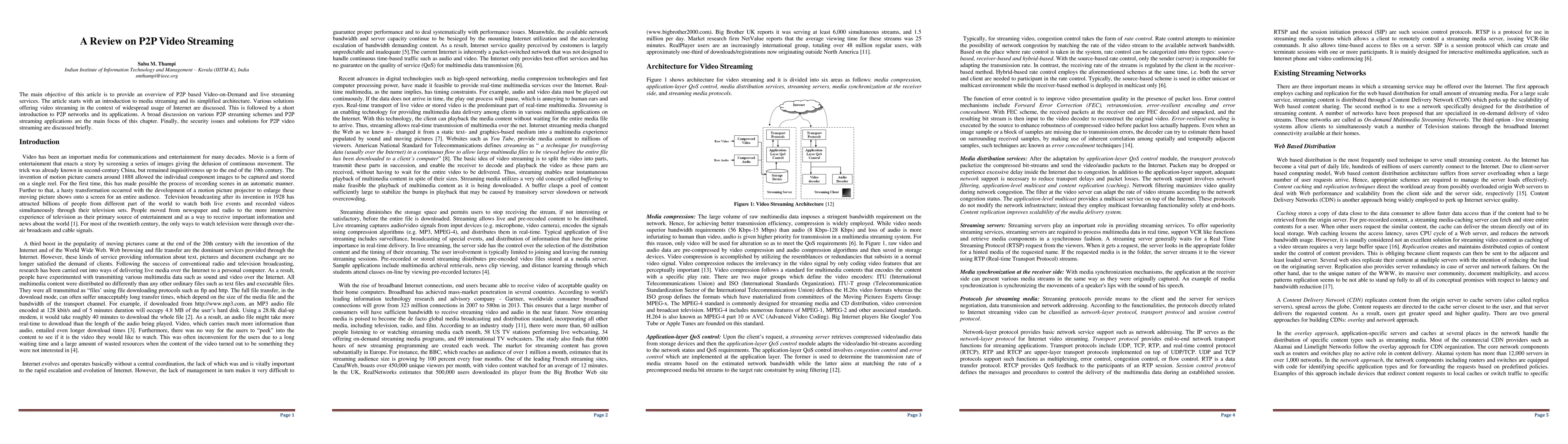 The main objective of this article is to provide an overview of P2P based Video-on-Demand and live streaming services. The article starts with an introduction to media streaming and its simplified architecture. Various solutions offering video streaming in the context of widespread usage of Internet are discussed. This is followed by a short introduction to P2P networks and its applications. A broad discussion on various P2P streaming schemes and P2P streaming applications are the main focus of this chapter. Finally, the security issues and solutions for P2P video streaming are discussed briefly.