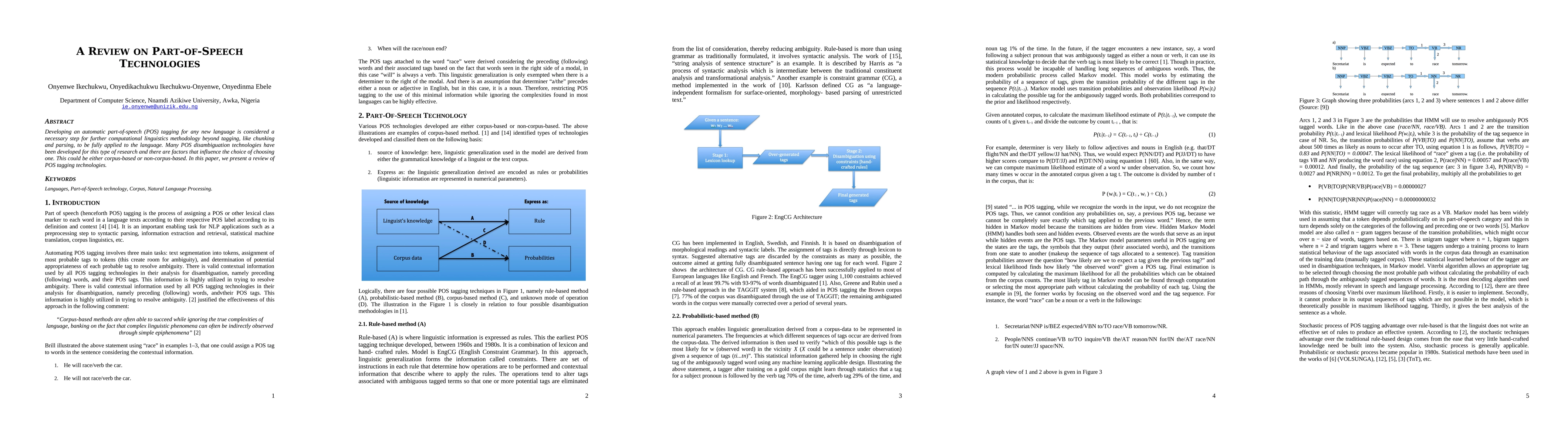 Developing an automatic part-of-speech (POS) tagging for any new language is considered a necessary step for further computational linguistics methodology beyond tagging, like chunking and parsing, to be fully applied to the language. Many POS disambiguation technologies have been developed for this type of research and there are factors that influence the choice of choosing one. This could be either corpus-based or non-corpus-based. In this paper, we present a review of POS tagging technologies.