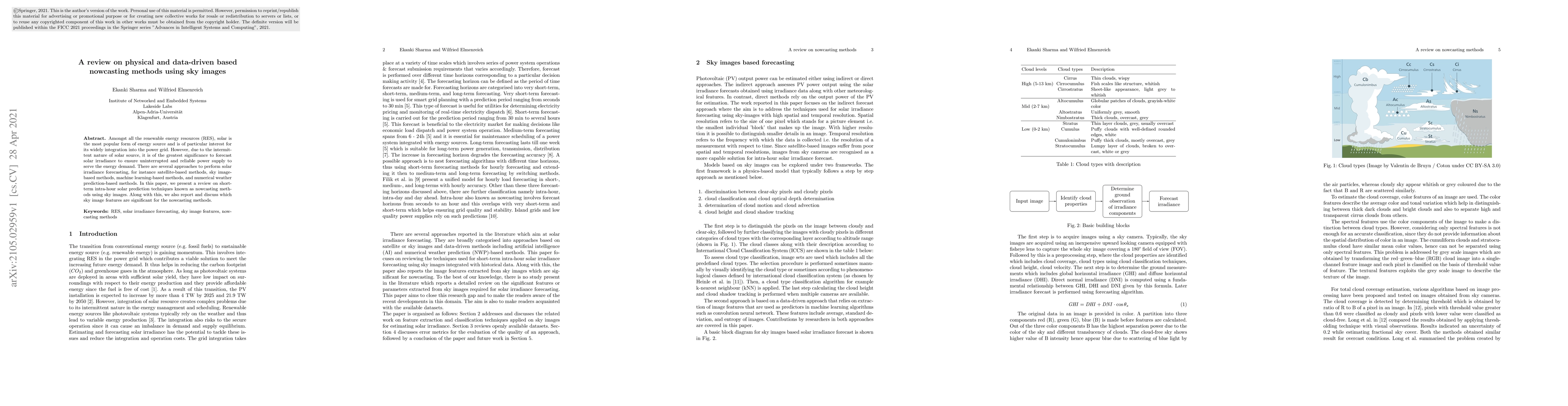 Amongst all the renewable energy resources (RES), solar is the most popular form of energy source and is of particular interest for its widely integration into the power grid. However, due to the intermittent nature of solar source, it is of the greatest significance to forecast solar irradiance to ensure uninterrupted and reliable power supply to serve the energy demand. There are several approaches to perform solar irradiance forecasting, for instance satellite-based methods, sky image-based methods, machine learning-based methods, and numerical weather prediction-based methods. In this paper, we present a review on short-term intra-hour solar prediction techniques known as nowcasting methods using sky images. Along with this, we also report and discuss which sky image features are significant for the nowcasting methods.