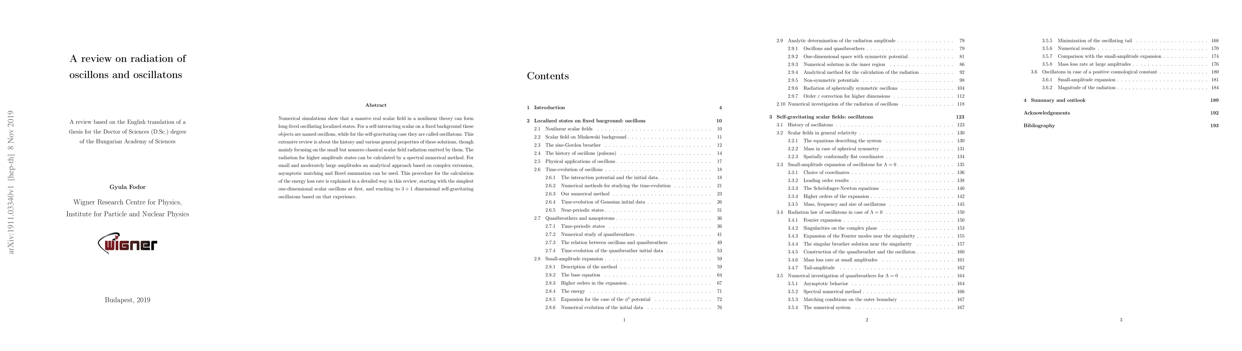 This review explores the formation and properties of oscillons and oscillatons, long-lived oscillating localized states in nonlinear scalar fields, focusing on their radiation. It details analytical and numerical methods for calculating the emitted radiation, starting from one-dimensional scalar oscillons and extending to three-dimensional self-gravitating oscillatons.