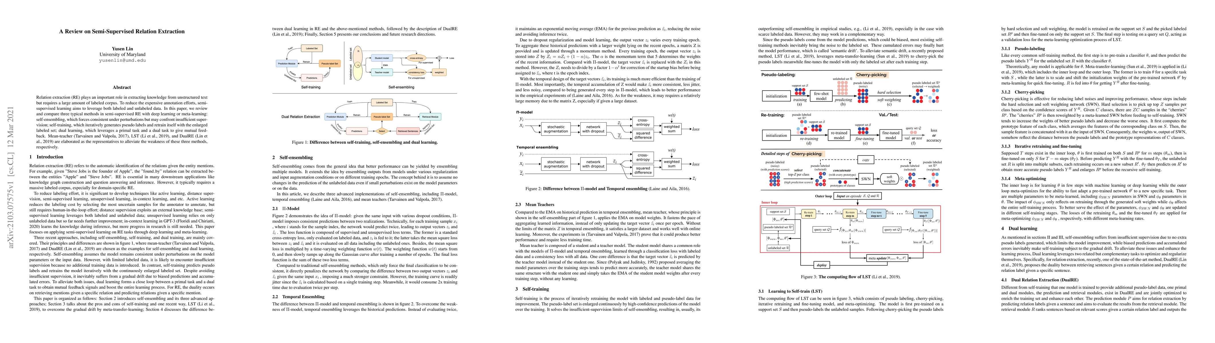 This paper reviews three semi-supervised methods for relation extraction: self-ensembling, self-training, and dual learning. It elaborates on representative models like Mean-teacher, LST, and DualRE to address the weaknesses of each method.