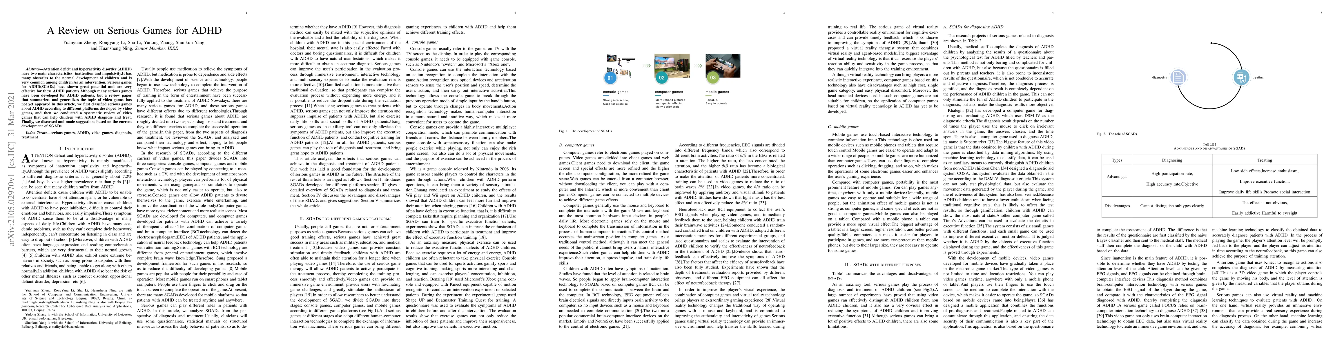 Attention deficit and hyperactivity disorder (ADHD) have two main characteristics: inattention and impulsivity.It has many obstacles to the normal development of children and is very common among children.As an intervention, Serious games for ADHD(SGADs) have shown great potential and are very effective for these ADHD patients.Although many serious games have been developed for ADHD patients, but a review paper that summarizes and generalizes the topic of video games has not yet appeared.In this article, we first classified serious games about ADHD according to different platforms developed by video games, and then we conducted a systematic review of video games that can help children with ADHD diagnose and treat. Finally, we discussed and made suggestions based on the current development of SGADs.