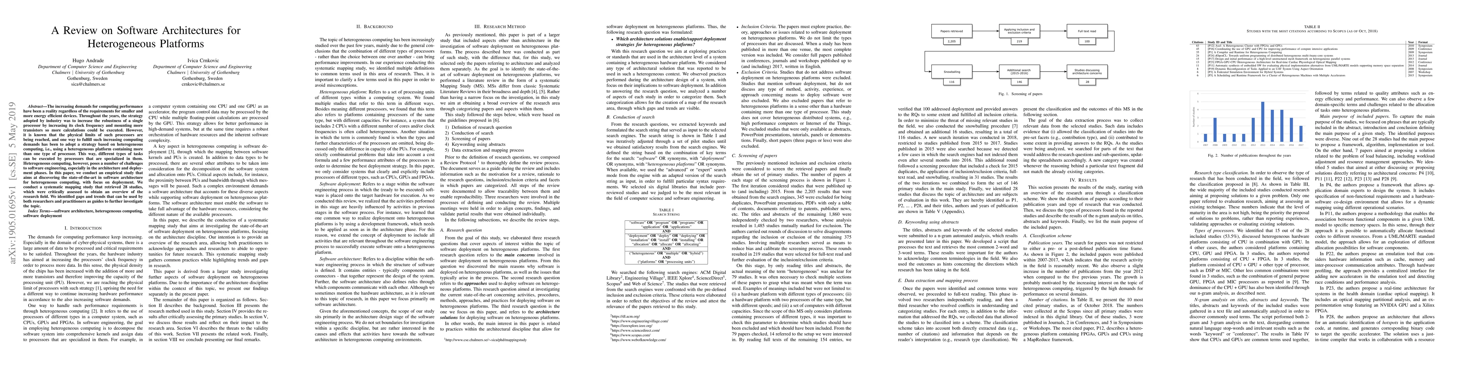 This paper reviews software architectures for heterogeneous computing platforms, focusing on deployment challenges. Through a systematic mapping study, it identifies current trends and gaps in the field, providing valuable insights for both researchers and practitioners.