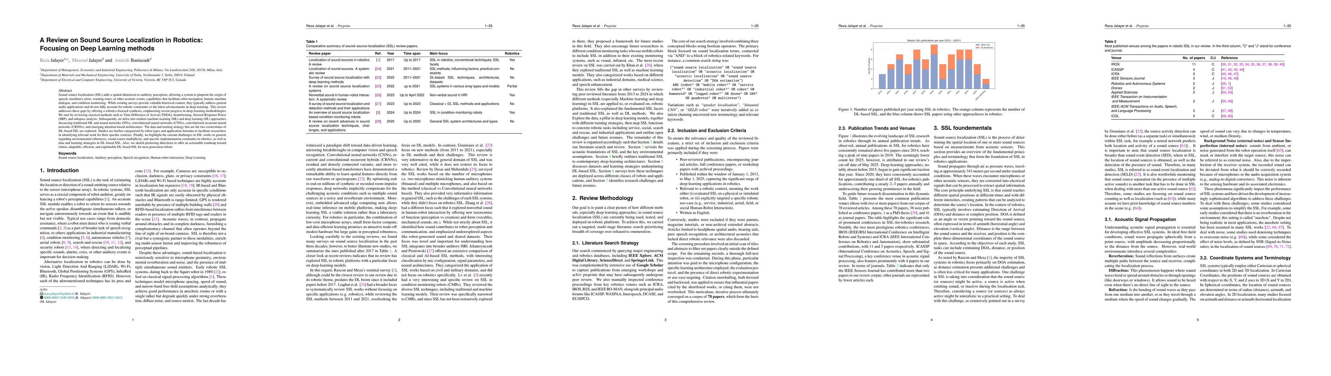 Sound source localization (SSL) adds a spatial dimension to auditory perception, allowing a system to pinpoint the origin of speech, machinery noise, warning tones, or other acoustic events, capabilities that facilitate robot navigation, human-machine dialogue, and condition monitoring. While existing surveys provide valuable historical context, they typically address general audio applications and do not fully account for robotic constraints or the latest advancements in deep learning. This review addresses these gaps by offering a robotics-focused synthesis, emphasizing recent progress in deep learning methodologies. We start by reviewing classical methods such as Time Difference of Arrival (TDOA), beamforming, Steered-Response Power (SRP), and subspace analysis. Subsequently, we delve into modern machine learning (ML) and deep learning (DL) approaches, discussing traditional ML and neural networks (NNs), convolutional neural networks (CNNs), convolutional recurrent neural networks (CRNNs), and emerging attention-based architectures. The data and training strategy that are the two cornerstones of DL-based SSL are explored. Studies are further categorized by robot types and application domains to facilitate researchers in identifying relevant work for their specific contexts. Finally, we highlight the current challenges in SSL works in general, regarding environmental robustness, sound source multiplicity, and specific implementation constraints in robotics, as well as data and learning strategies in DL-based SSL. Also, we sketch promising directions to offer an actionable roadmap toward robust, adaptable, efficient, and explainable DL-based SSL for next-generation robots.