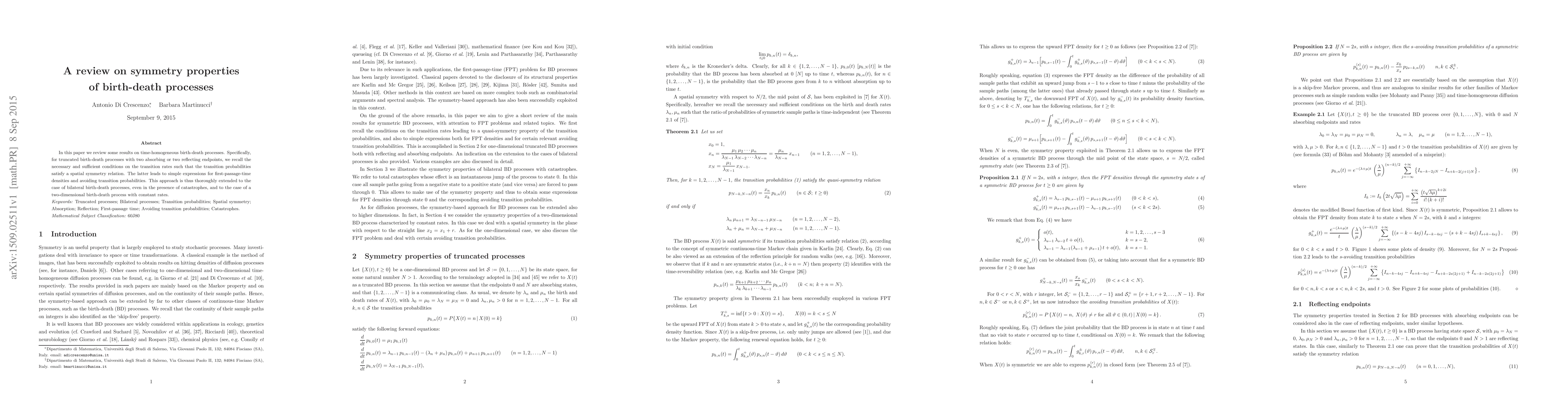 This paper reviews symmetry properties in time-homogeneous birth-death processes, focusing on conditions ensuring spatial symmetry in truncated processes. It also extends these findings to bilateral processes and two-dimensional models with constant rates, simplifying first-passage-time densities.