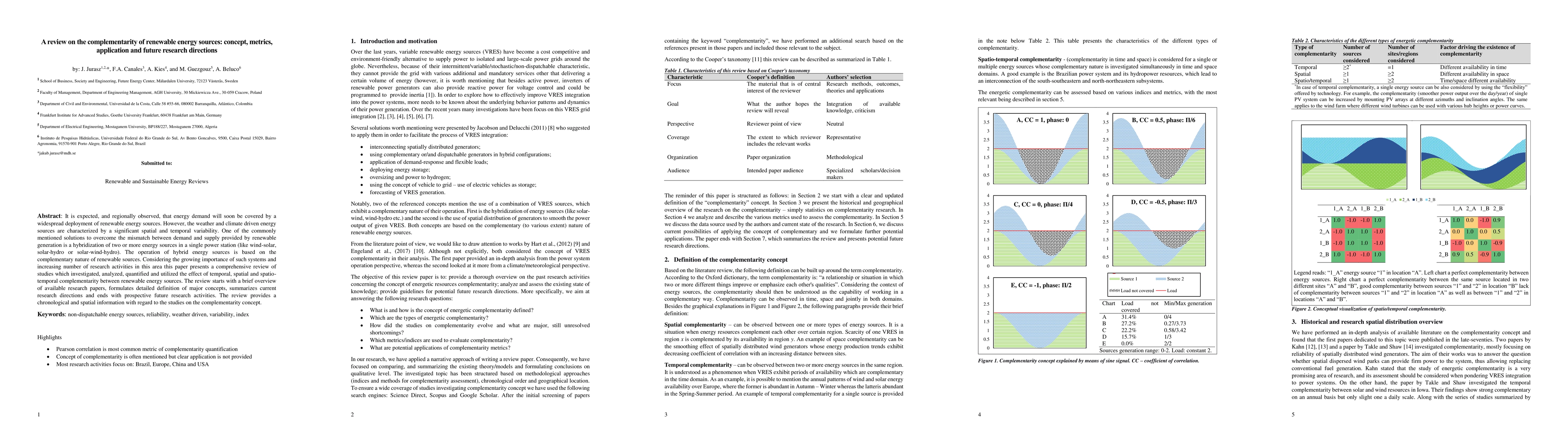It is expected, and regionally observed, that energy demand will soon be covered by a widespread deployment of renewable energy sources. However, the weather and climate driven energy sources are characterized by a significant spatial and temporal variability. One of the commonly mentioned solutions to overcome the mismatch between demand and supply provided by renewable generation is a hybridization of two or more energy sources in a single power station (like wind-solar, solar-hydro or solar-wind-hydro). The operation of hybrid energy sources is based on the complementary nature of renewable sources. Considering the growing importance of such systems and increasing number of research activities in this area this paper presents a comprehensive review of studies which investigated, analyzed, quantified and utilized the effect of temporal, spatial and spatio-temporal complementarity between renewable energy sources. The review starts with a brief overview of available research papers, formulates detailed definition of major concepts, summarizes current research directions and ends with prospective future research activities. The review provides a chronological and spatial information with regard to the studies on the complementarity concept.