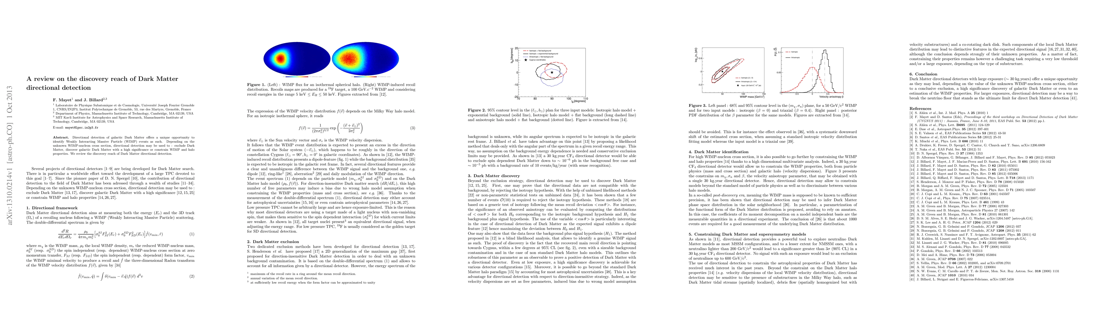 Directional detection of galactic Dark Matter offers a unique opportunity to identify Weakly Interacting Massive Particle (WIMP) events as such. Depending on the unknown WIMP-nucleon cross section, directional detection may be used to : exclude Dark Matter, discover galactic Dark Matter with a high significance or constrain WIMP and halo properties. We review the discovery reach of Dark Matter directional detection.