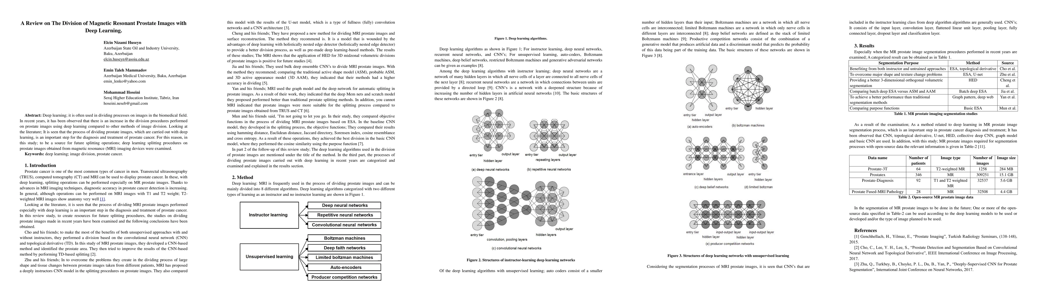 Deep learning; it is often used in dividing processes on images in the biomedical field. In recent years, it has been observed that there is an increase in the division procedures performed on prostate images using deep learning compared to other methods of image division. Looking at the literature; It is seen that the process of dividing prostate images, which are carried out with deep learning, is an important step for the diagnosis and treatment of prostate cancer. For this reason, in this study; to be a source for future splitting operations; deep learning splitting procedures on prostate images obtained from magnetic resonance (MRI) imaging devices were examined.