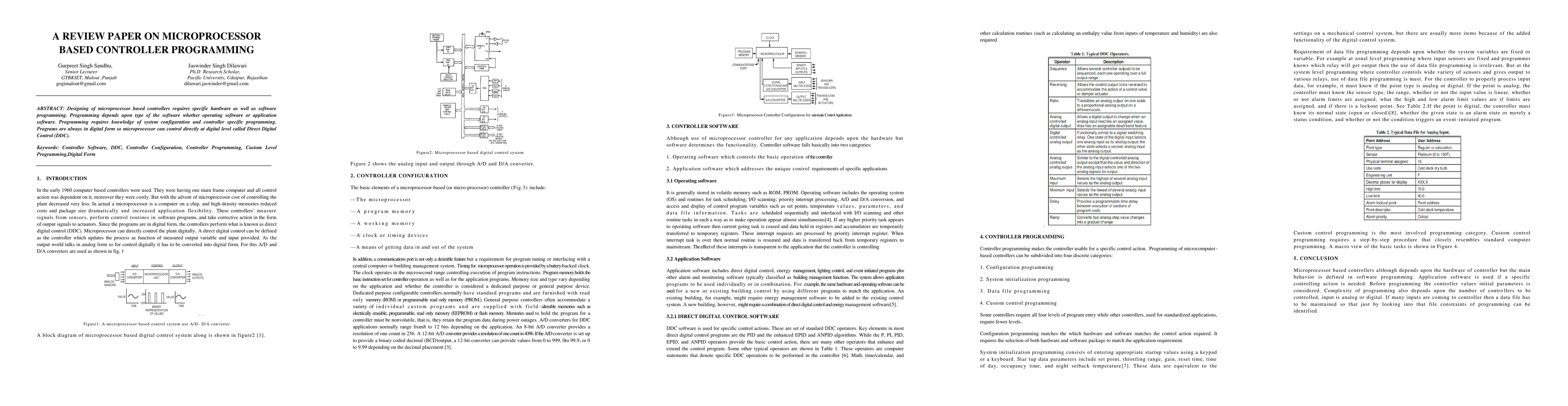This review paper discusses the design and programming of microprocessor-based controllers, emphasizing the necessity of both hardware and software programming, and the use of Direct Digital Control (DDC) for direct digital level control. It highlights the importance of understanding system configuration and controller-specific programming.