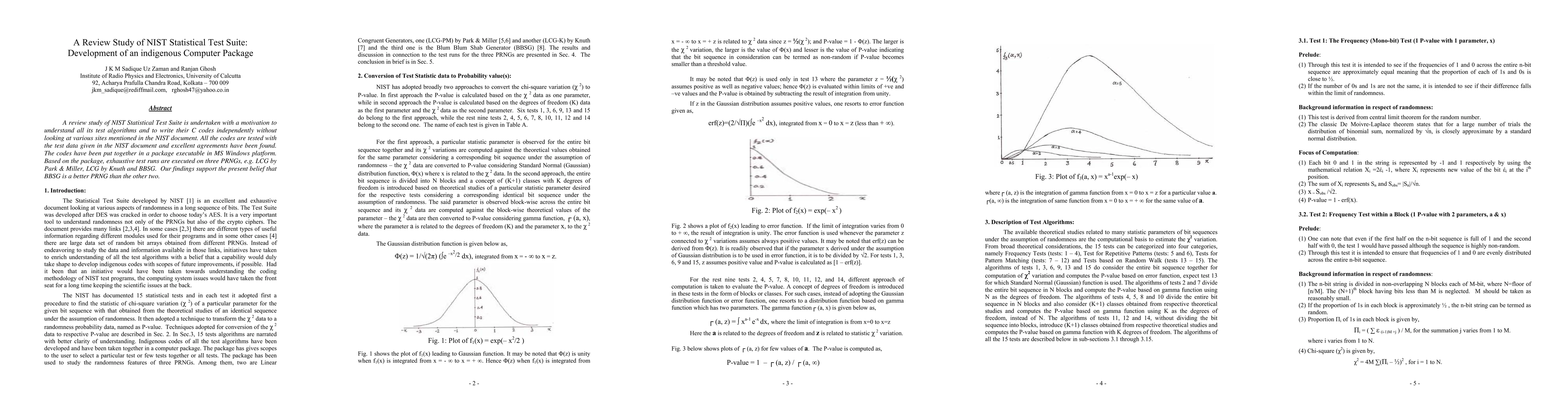 This study reviews the NIST Statistical Test Suite, independently coding its algorithms in C without referencing external sources. The developed package, executable on MS Windows, shows excellent agreement with NIST test data and supports the superiority of BBSG as a pseudorandom number generator over LCG by Park & Miller and LCG by Knuth.