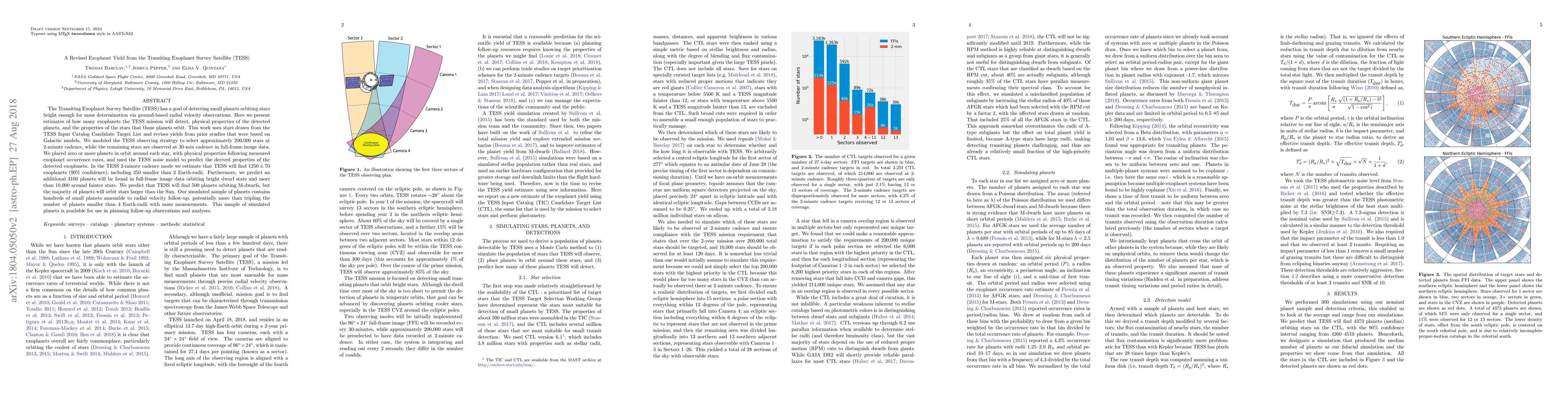 The TESS mission is expected to detect approximately 1250 exoplanets, including 250 smaller than 2 Earth-radii, with additional discoveries in full-frame image data, potentially tripling the number of small planets with mass measurements. The majority of detected planets will orbit stars larger than the Sun.