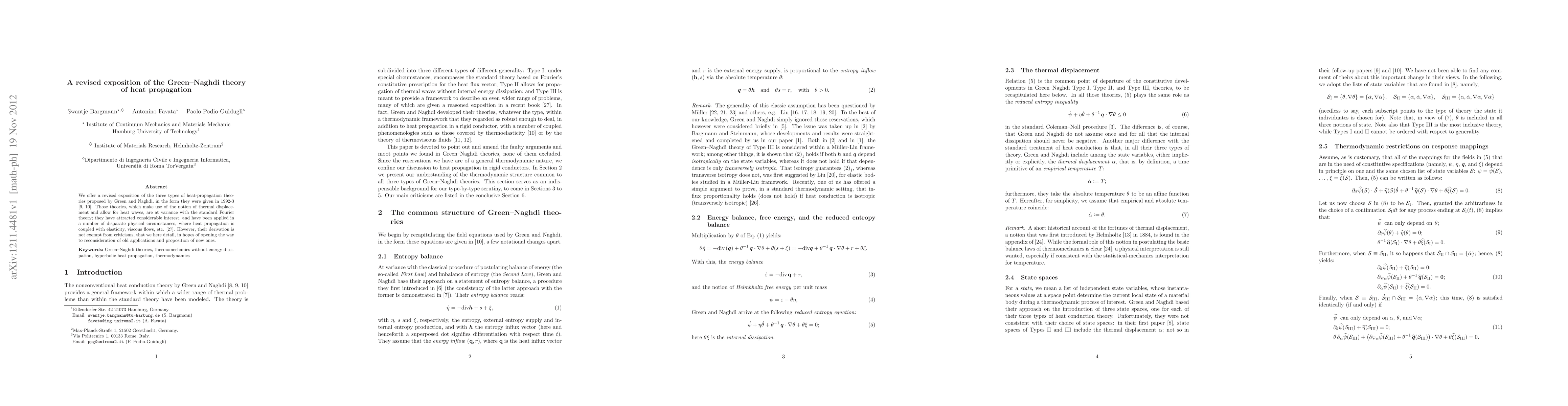 We offer a revised exposition of the three types of heat-propagation theories proposed by Green and Naghdi, in the form they were given in 1992-3. Those theories, which make use of the notion of thermal displacement and allow for heat waves, are at variance with the standard Fourier theory; they have attracted considerable interest, and have been applied in a number of disparate physical circumstances, where heat propagation is coupled with elasticity, viscous flows, etc. However, their derivation is not exempt from criticisms, that we here detail, in hopes of opening the way to reconsideration of old applications and proposition of new ones.