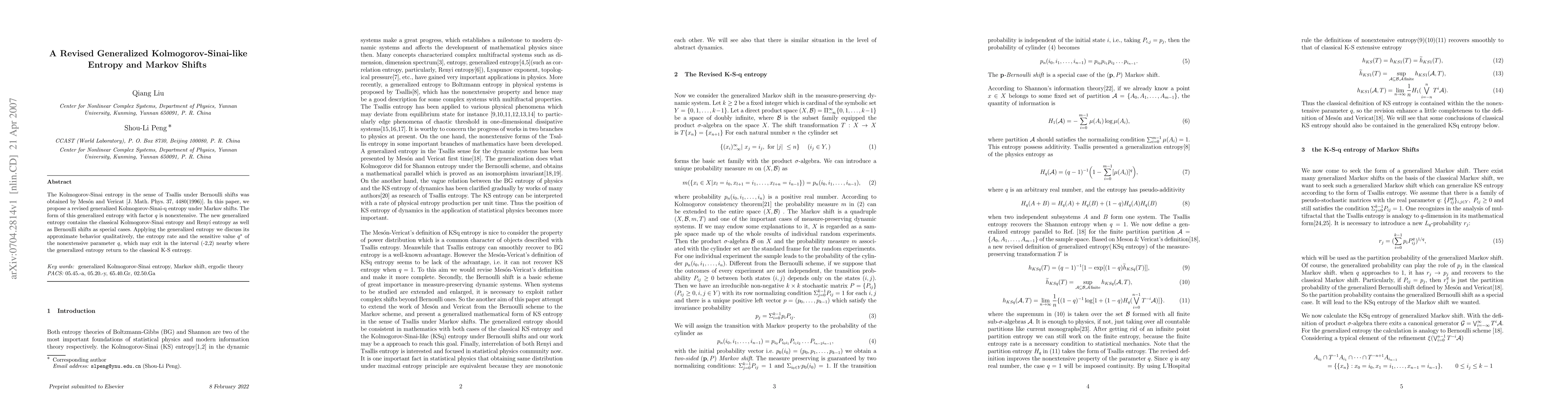 The Kolmogorov-Sinai entropy in the sense of Tsallis under Bernoulli shifts was obtained by Meson and Vericat [J. Math. Phys. 37, 4480(1996)]. In this paper, we propose a revised generalized Kolmogorov-Sinai-q entropy under Markov shifts. The form of this generalized entropy with factor q is nonextensive. The new generalized entropy contains the classical Kolmogorov-Sinai entropy and Renyi entropy as well as Bernoulli shifts as special cases. Applying the generalized entropy we discuss its approximate behavior qualitatively, the entropy rate and the sensitive value q^* of the nonextensive parameter q, which may exit in the interval (-2,2) nearby where the generalized entropy return to the classical K-S entropy.