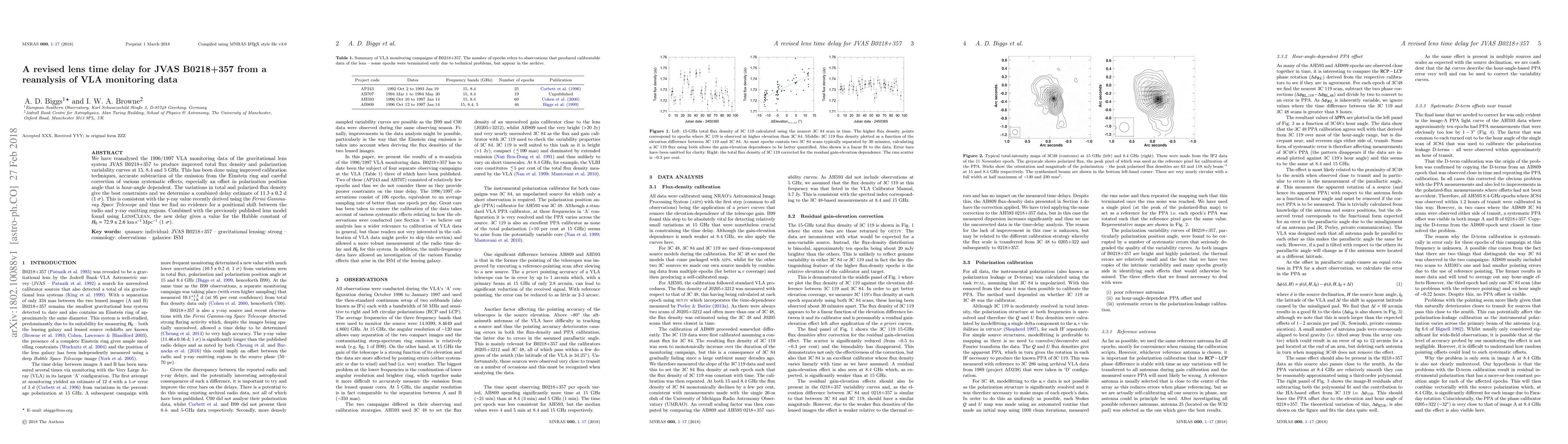 This paper reanalyzes VLA monitoring data for the gravitational lens system JVAS B0218+357, improving flux density and polarization variability curves, leading to a revised time delay estimate of $11.3 \pm 0.2$ days and a Hubble constant value of $H_0 = 72.9 \pm 2.6$ km s$^{-1}$ Mpc$^{-1}$.