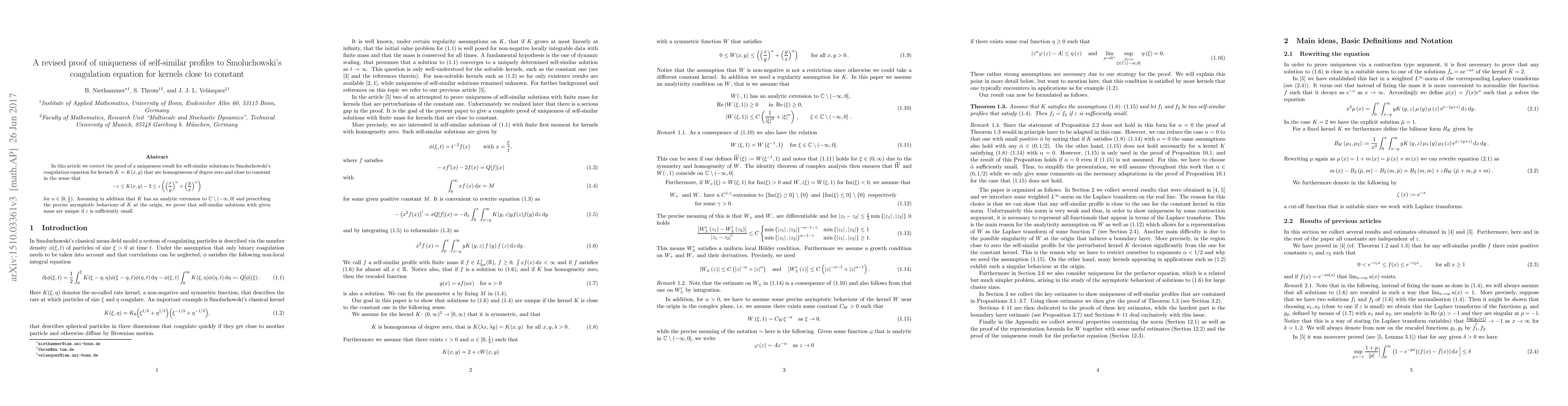 This paper corrects the proof of uniqueness for self-similar solutions to Smoluchowski's coagulation equation for kernels that are nearly constant and homogeneous of degree zero. The authors demonstrate that under specific conditions on the kernel's behavior, self-similar solutions with a given mass are unique when the kernel's deviation from constant is sufficiently small.