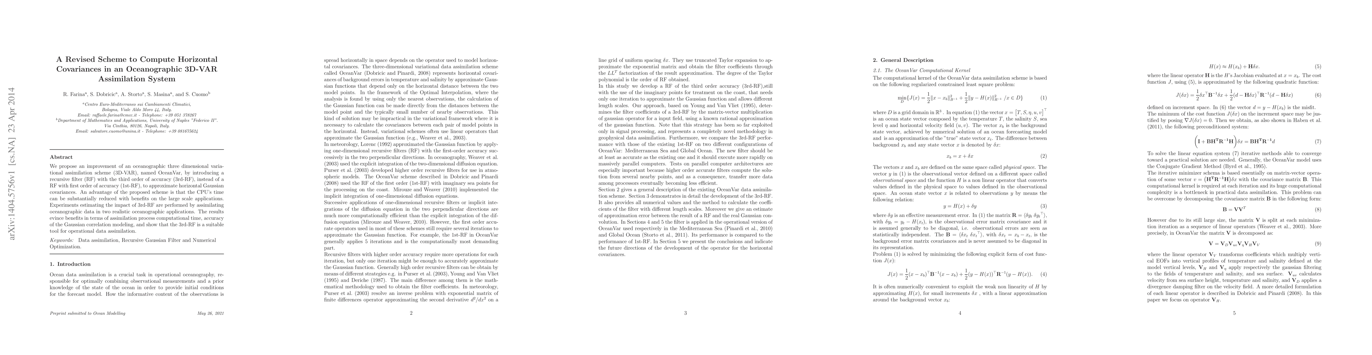 This paper proposes an enhanced oceanographic 3D-VAR assimilation scheme, OceanVar, using a third-order recursive filter (3rd-RF) to improve horizontal covariance computation, reducing computational time and improving accuracy. Experiments demonstrate significant benefits in computational efficiency and data assimilation accuracy.