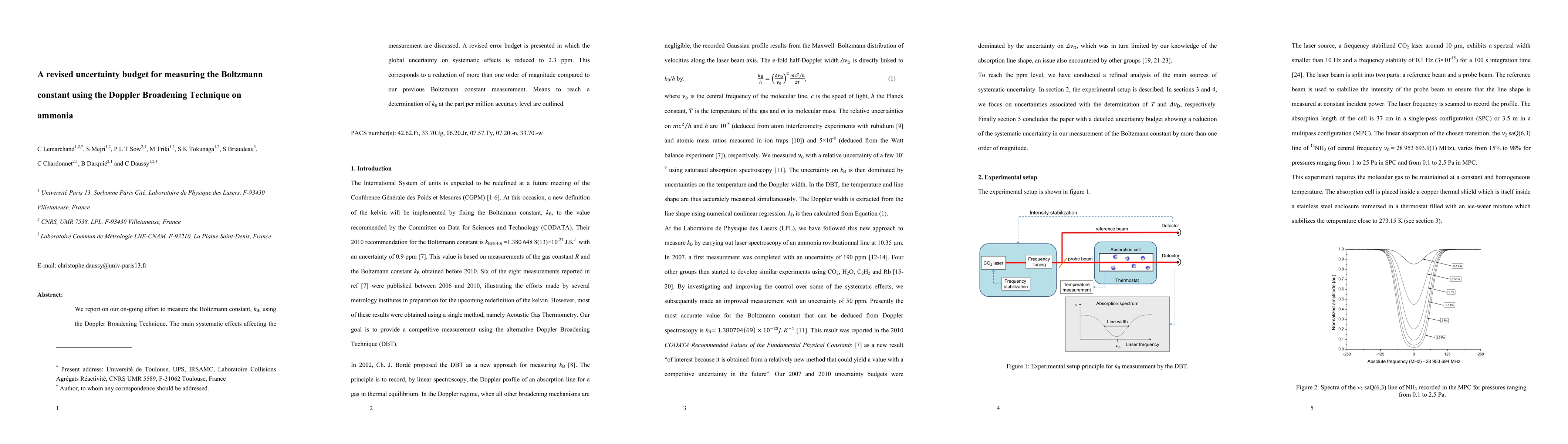 This paper presents a revised uncertainty budget for measuring the Boltzmann constant using the Doppler Broadening Technique on ammonia, achieving a global systematic uncertainty reduction to 2.3 ppm, significantly improving upon previous measurements and outlining strategies for reaching part per million accuracy.