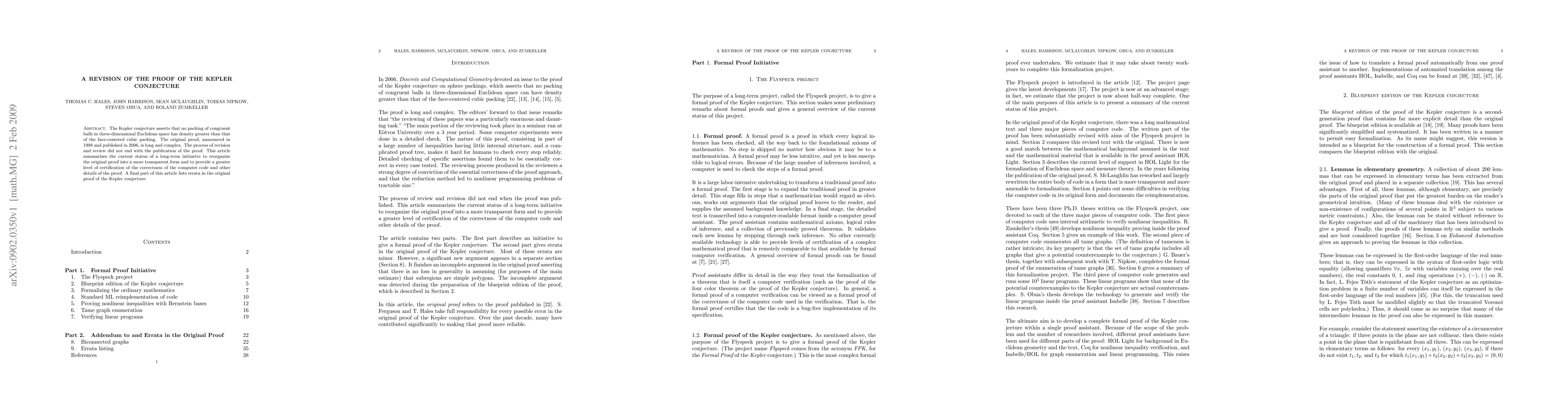 This paper details ongoing efforts to simplify and verify the original proof of the Kepler conjecture, which claims the face-centered cubic packing maximizes density in three-dimensional ball packings. It also lists corrections made to the initial complex proof.