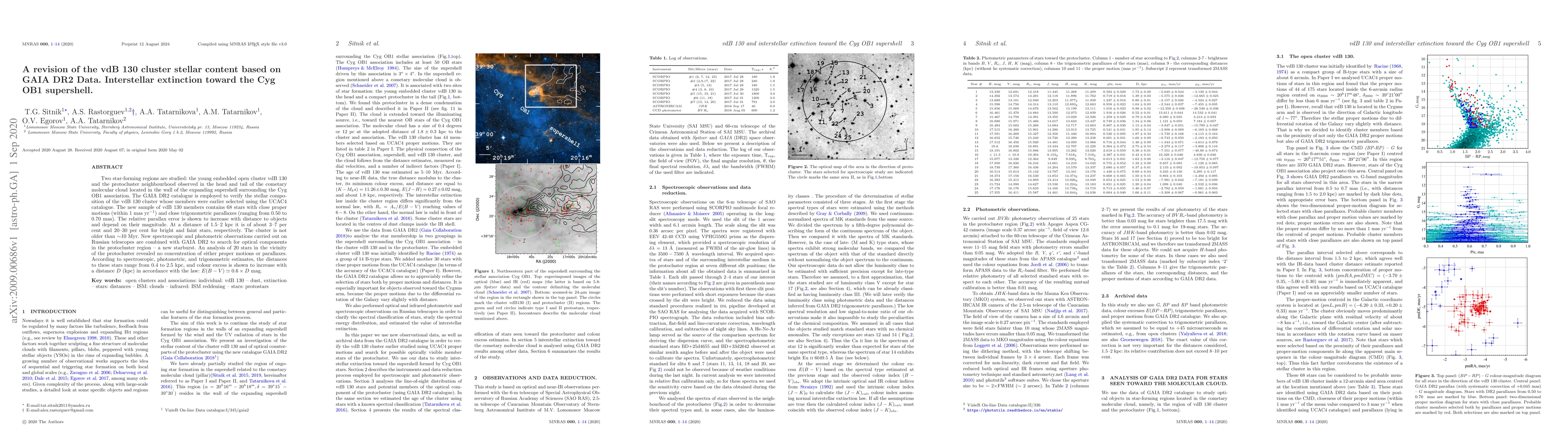 Two star-forming regions are studied: the young embedded open cluster vdB 130 and the protocluster neighbourhood observed in the head and tail of the cometary molecular cloud located in the wall of the expanding supershell surrounding the Cyg OB1 association. The GAIA DR2 catalogue is employed to verify the stellar composition of the vdB 130 cluster whose members were earlier selected using the UCAC4 catalogue. The new sample of vdB 130 members contains 68 stars with close proper motions (within 1 mas yr$^{-1}$) and close trigonometric parallaxes (ranging from 0.50 to 0.70 mas). The relative parallax error is shown to increase with distance to objects and depend on their magnitude. At a distance of 1.5-2 kpc it is of about 3-7 per cent and 20-30 per cent for bright and faint stars, respectively. The cluster is not older than ~10 Myr. New spectroscopic and photometric observations carried out on Russian telescopes are combined with GAIA DR2 to search for optical components in the protocluster region - a new starburst. An analysis of 20 stars in the vicinity of the protocluster revealed no concentration of either proper motions or parallaxes. According to spectroscopic, photometric, and trigonometric estimates, the distances to these stars range from 0.4 to 2.5 kpc, and colour excess is shown to increase with a distance D (kpc) in accordance with the law: $E(B-V)\simeq 0.6\times D$ mag.