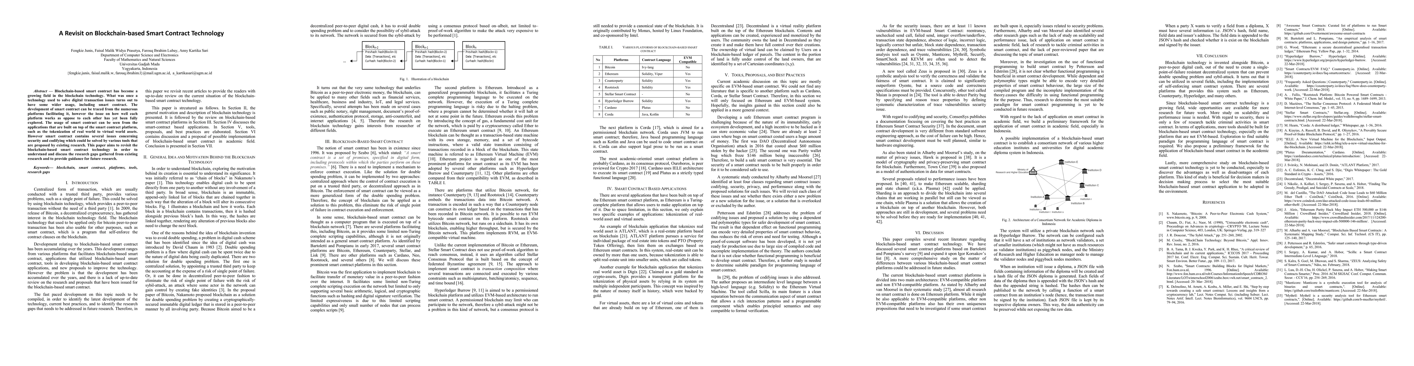 Blockchain-based smart contract has become a growing field in the blockchain technology. What was once a technology used to solve digital transaction issues turns out to have some wider usage, including smart contract. The development of smart contract can be traced from the numerous platforms facilitating it, however the issue on how well each platform works as oppose to each other has yet been fully explored. The usage of smart contract can be seen from the applications that are built on top of the smart contract platform, such as the tokenization of real world to virtual world assets. However smart contract contains several issues concerning security and codifying which could be solved by various tools that are proposed by existing research. This paper aims to revisit the blockchain-based smart contract technology in order to understand and discuss the research gaps gathered from existing research and to provide guidance for future research.
