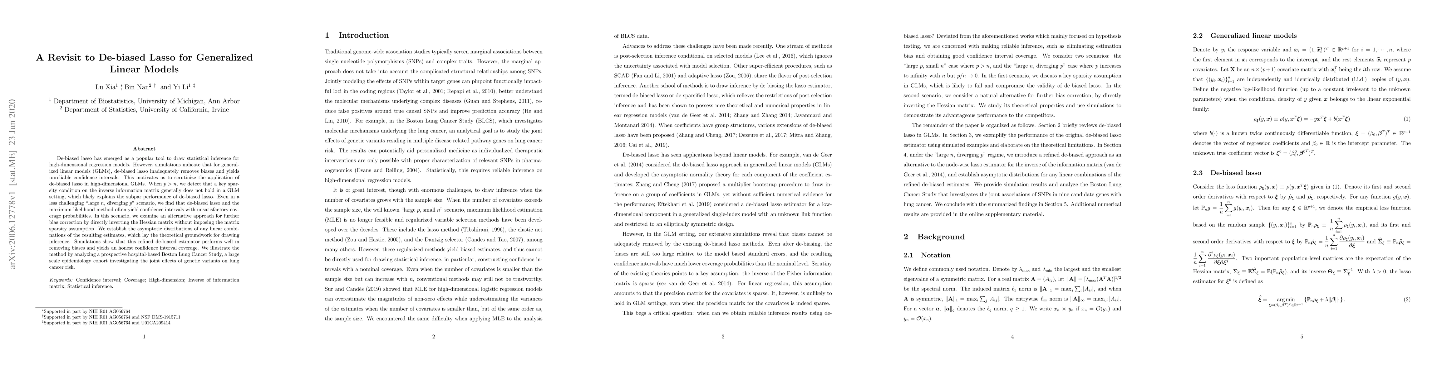 This paper revisits the application of de-biased lasso for generalized linear models, finding it inadequate for bias removal and unreliable confidence intervals. It proposes an alternative approach by inverting the Hessian matrix without sparsity assumptions, which shows improved performance in simulations and is demonstrated on a Boston Lung Cancer Study dataset.